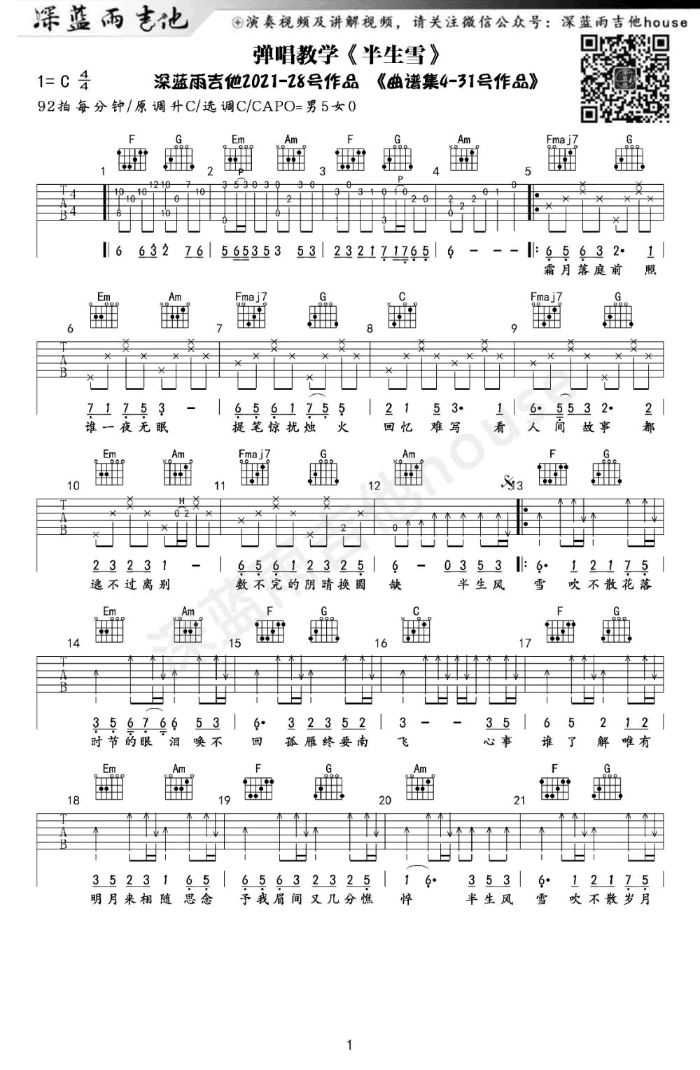 - 半生雪吉他谱_是七叔呢_C调女生版_吉他教学视频