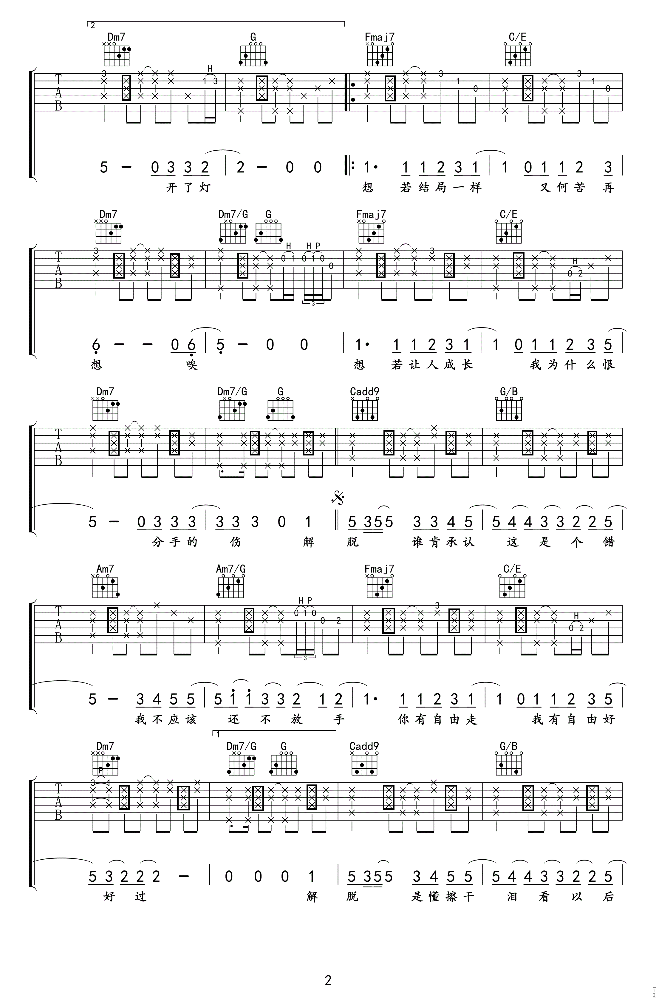 张惠妹《解脱》吉他谱,C调指法,变调夹夹一品,解脱六线谱,完整版图片谱共四张谱例。