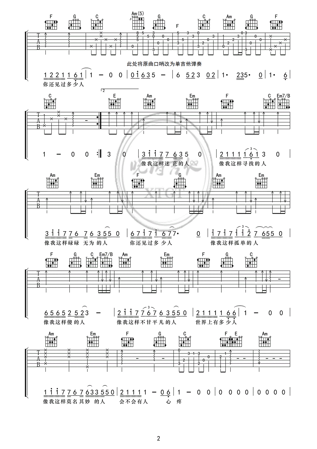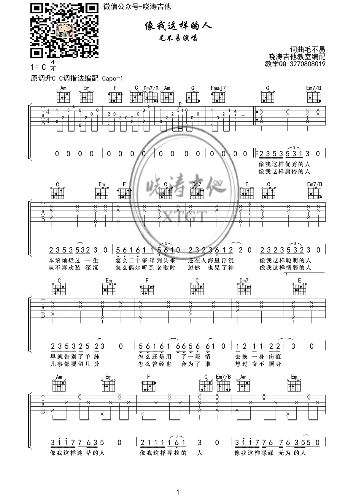 - 毛不易《像我这样的人》吉他谱 C调版本 六线谱弹唱谱