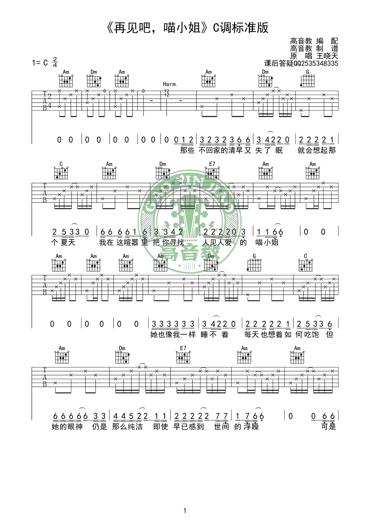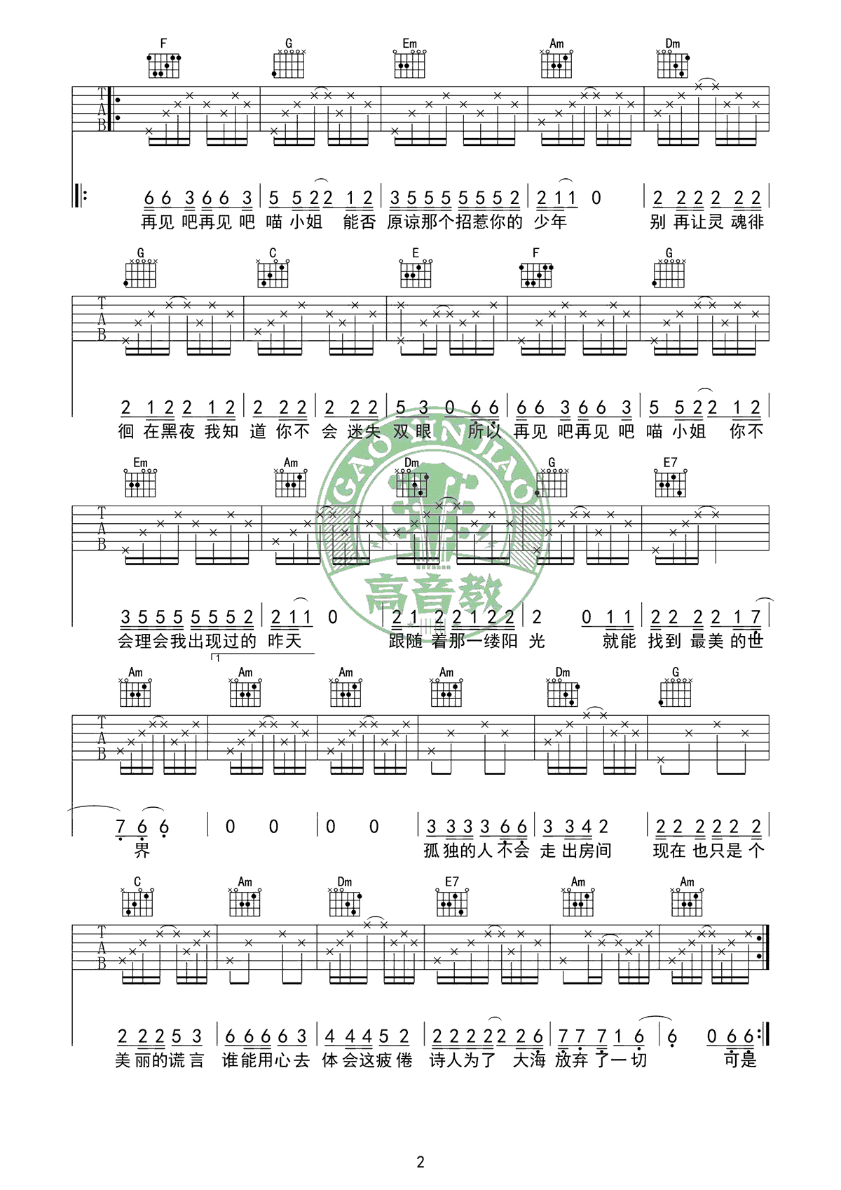 再见吧,喵小姐 (Live) 歌词 词:王晓天 曲:王晓天 那些不回家的清早又失了眠 又会想起那个夏天 我在这喧嚣里把你寻找 人见人爱的喵小姐 她也像我一样睡不着 每天也想着如何吃饱 但她的眼神仍是那么纯洁 即使早已感到世间的浮躁 可是再见吧 再见吧 喵小姐 能否原谅那个招惹你的少年 别让灵魂徘徊在那黑夜 我知道你不会迷失双眼 所以再见吧 再见吧 喵小姐 你不会理会我出现过的昨天 跟随那一缕阳光 就能找到最美的世界 孤独的人不会走出房间 现在也只是个美丽的谎言 谁能用心去体会这疲倦 诗人为了大海放弃了一切 可是再见吧 再见吧 喵小姐 能否原谅那个招惹你的少年 别让灵魂徘徊在那黑夜 我知道你不会迷失双眼 所以再见吧 再见吧 喵小姐 你不会理会我出现过的昨天 跟随那一缕阳光 就能找到最美的世界 可是再见吧 再见吧 喵小姐 你不会理会我出现过的昨天 听说梦里有个美丽的花园 盛开在你会出现的季节 所以再见吧 再见吧 喵小姐 我会带着微笑站在海的对面 跟随那一缕阳光 就能找到最美的世界 那些不回家的清早又失了眠 又会想起那个夏天 我在这喧嚣里把你寻找 人见人爱的喵小姐