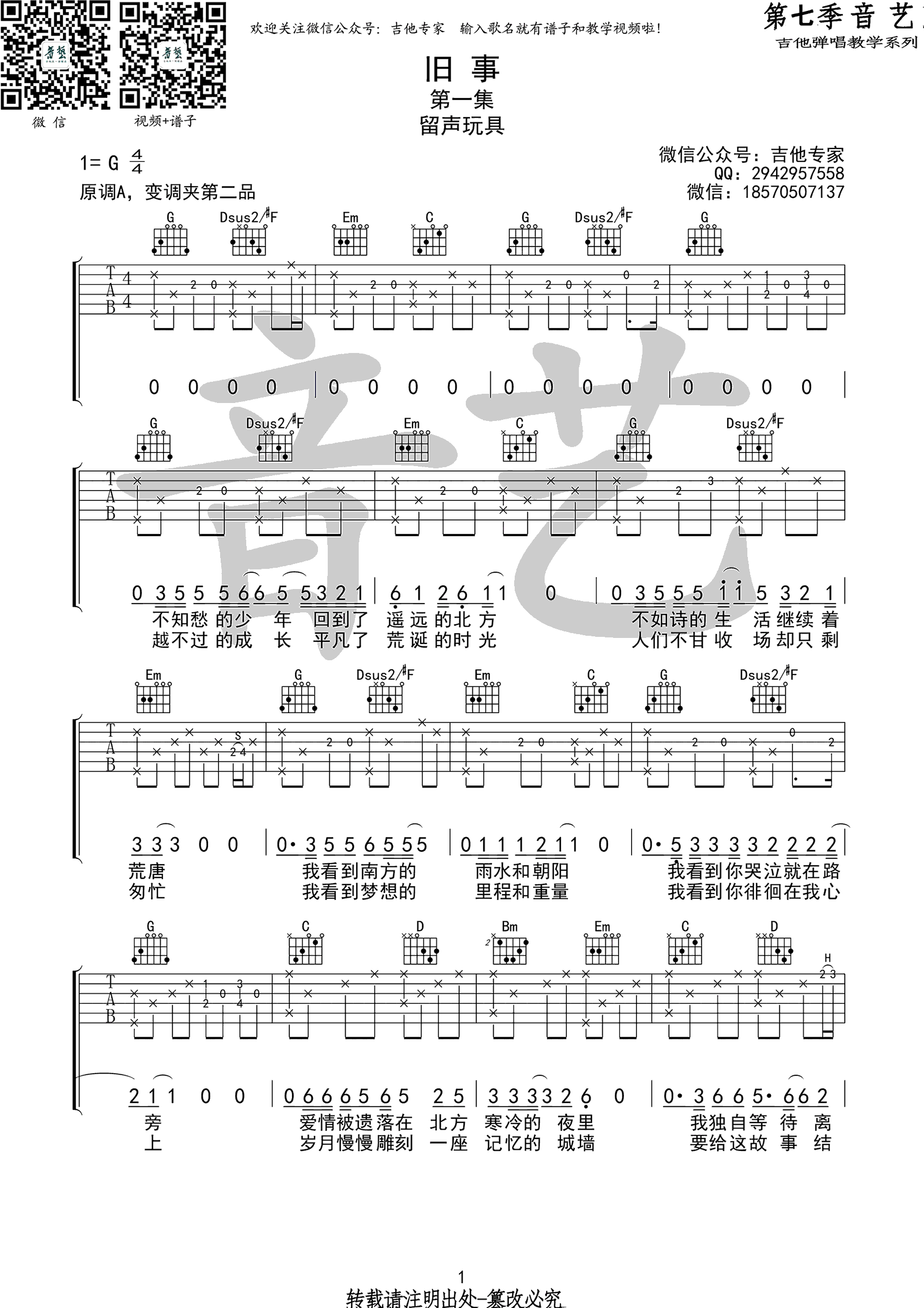 旧事吉他谱,留声玩具的一首民谣创作歌曲,《旧事》六线谱。三张图片谱,高清弹唱谱。原调A,选用G调指法,变调夹夹2品。感谢音艺的提供和分享,易唱网整理上传。还记得去年的这个时候,在篮球场听到留声的歌, 那个弹吉他的少年,往事都成了旧事。