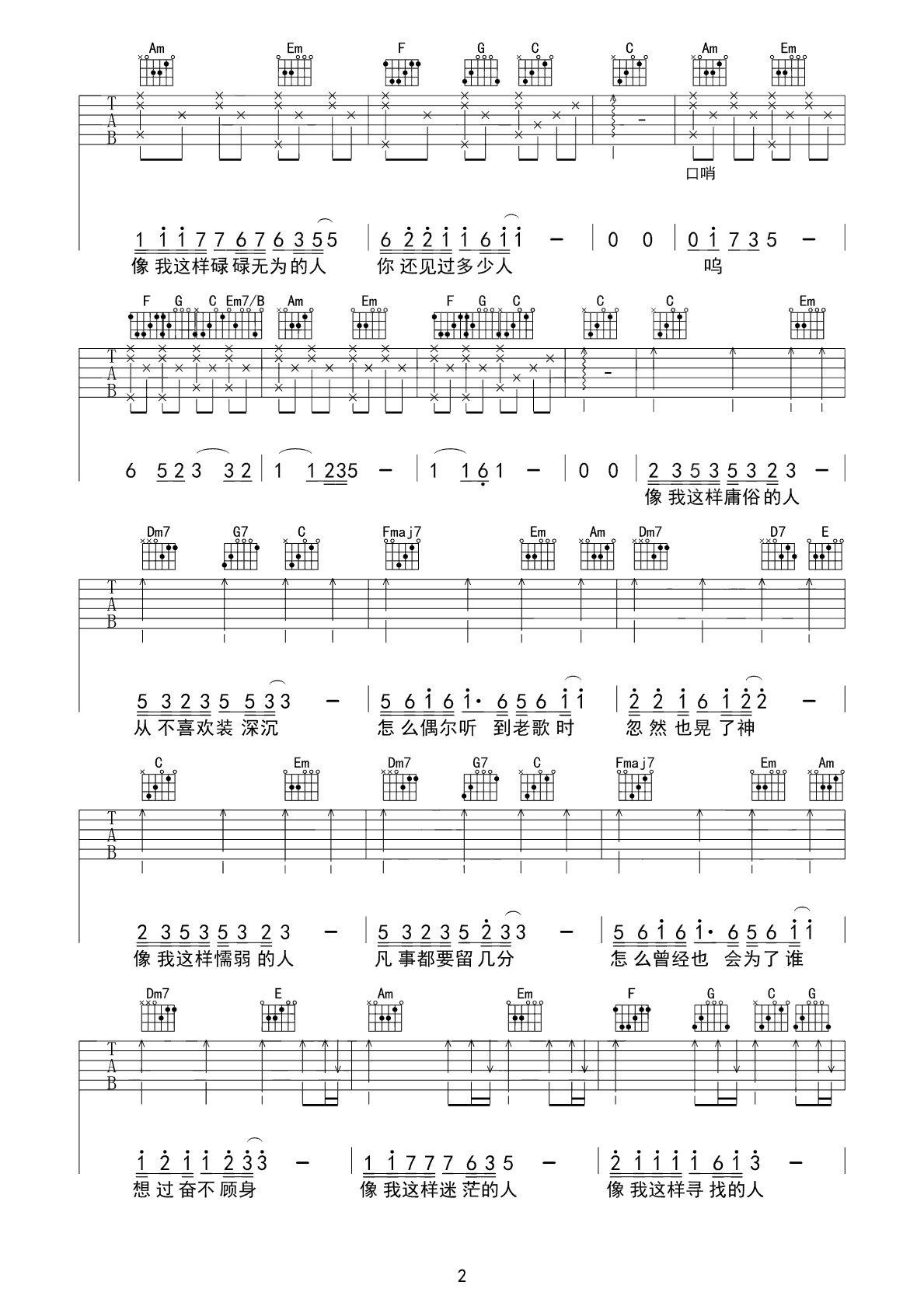- 毛不易《像我这样的人》吉他谱 C调版本 六线谱弹唱谱