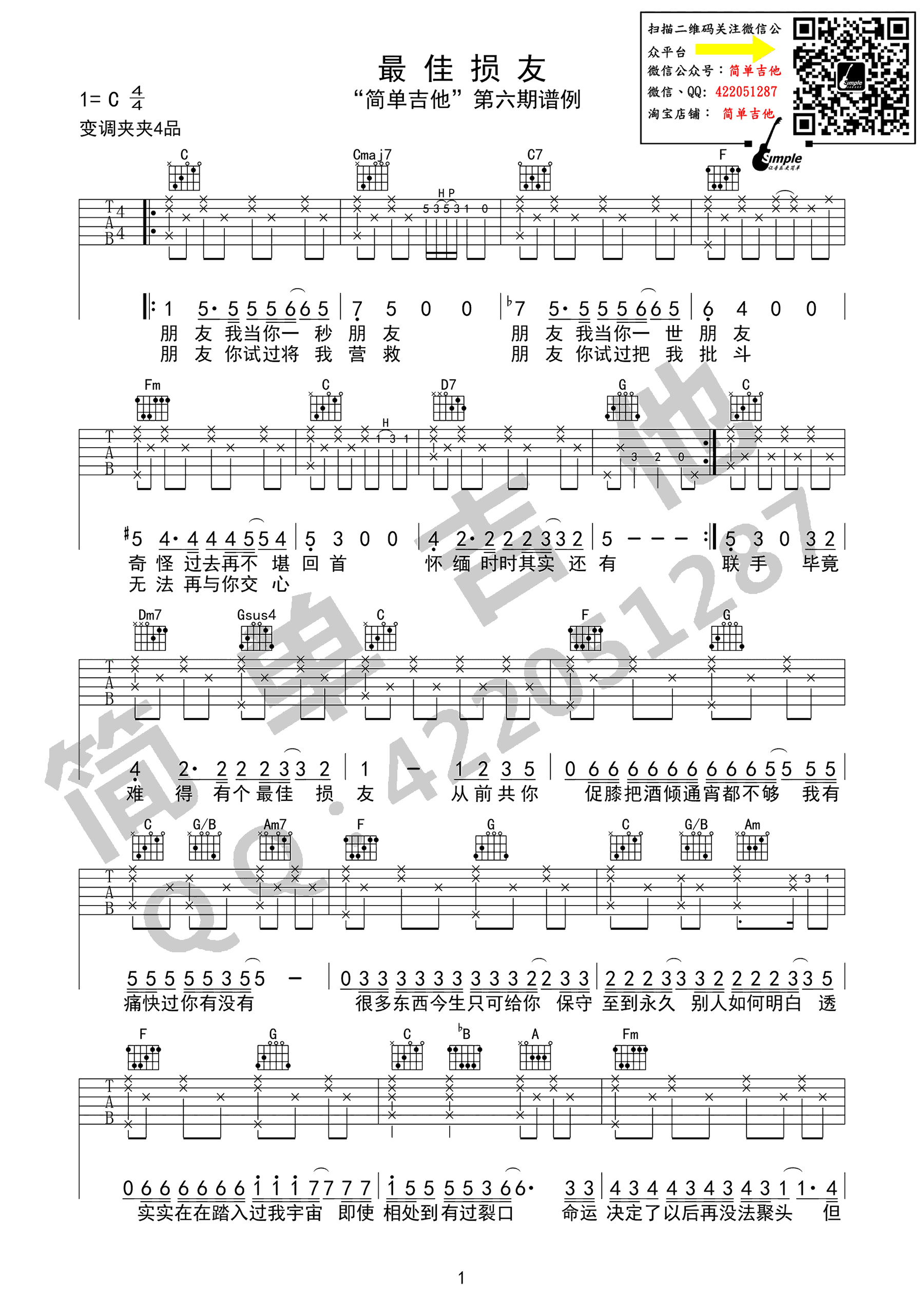 - 陈奕迅《好久不见》吉他谱 C调简单版 高清弹唱谱
