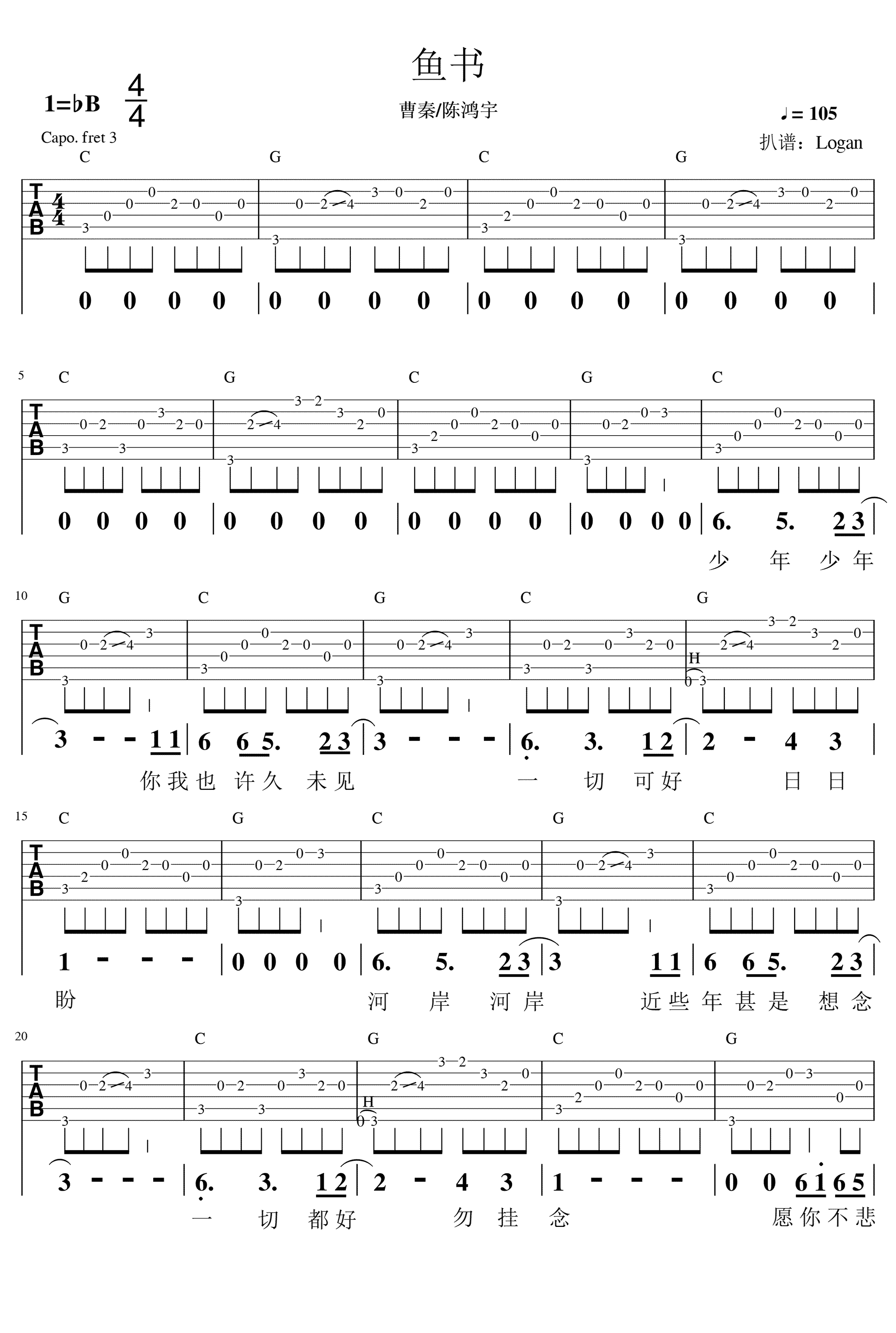 《鱼书》吉他谱,曹秦陈鸿宇演唱的一首民谣歌曲,鱼书六线谱,五张高清版图片弹唱谱,感谢Logan编配分享,易唱网上传。