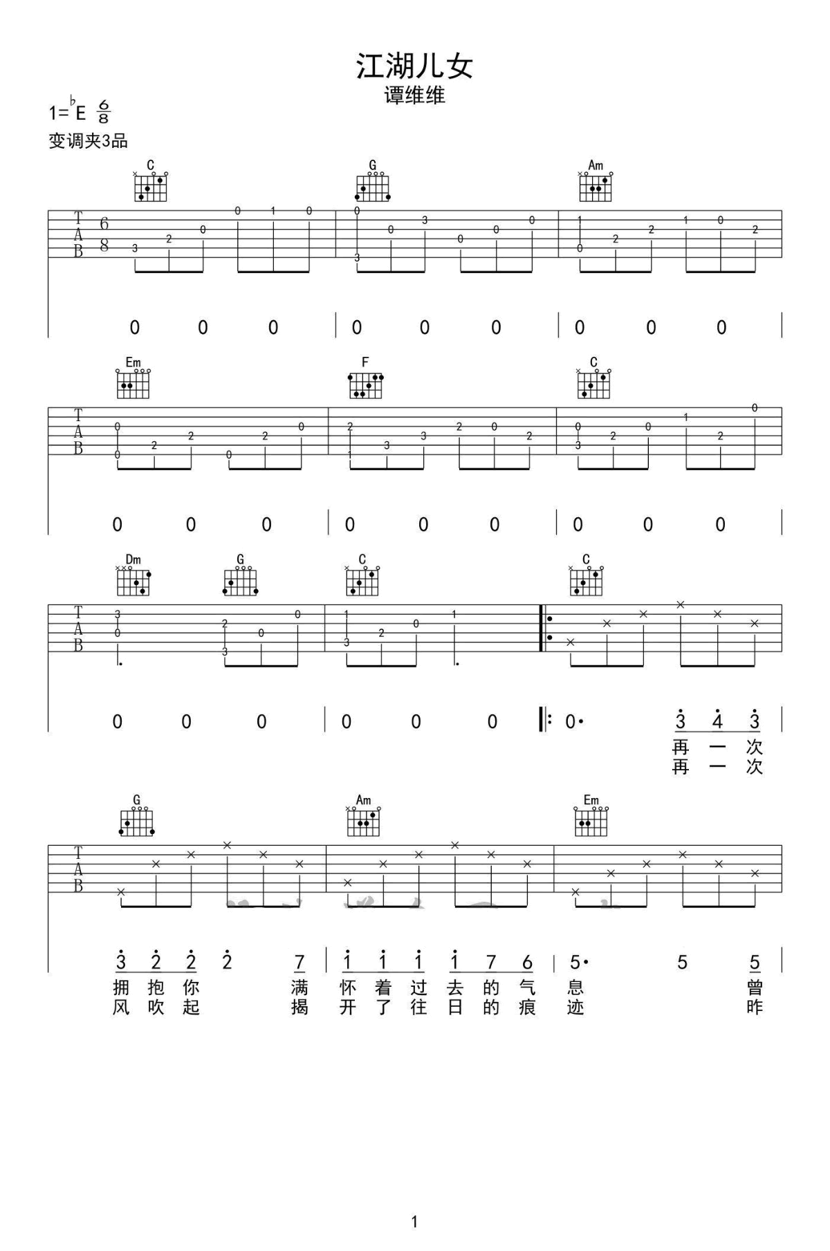 - 女儿情吉他谱 简单版弹唱谱 李玲玉《西游记》插曲