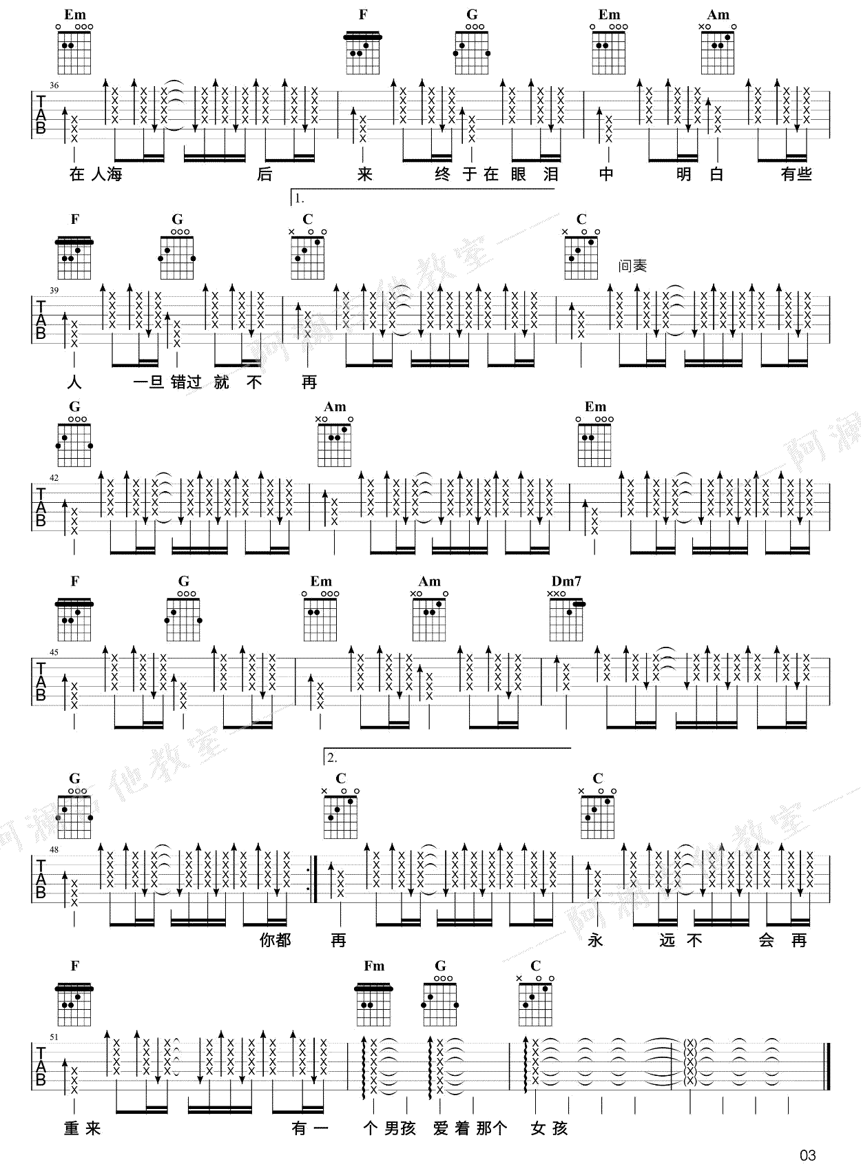 - 说散就散吉他谱 C调 六线谱高清版 弹唱视频演示