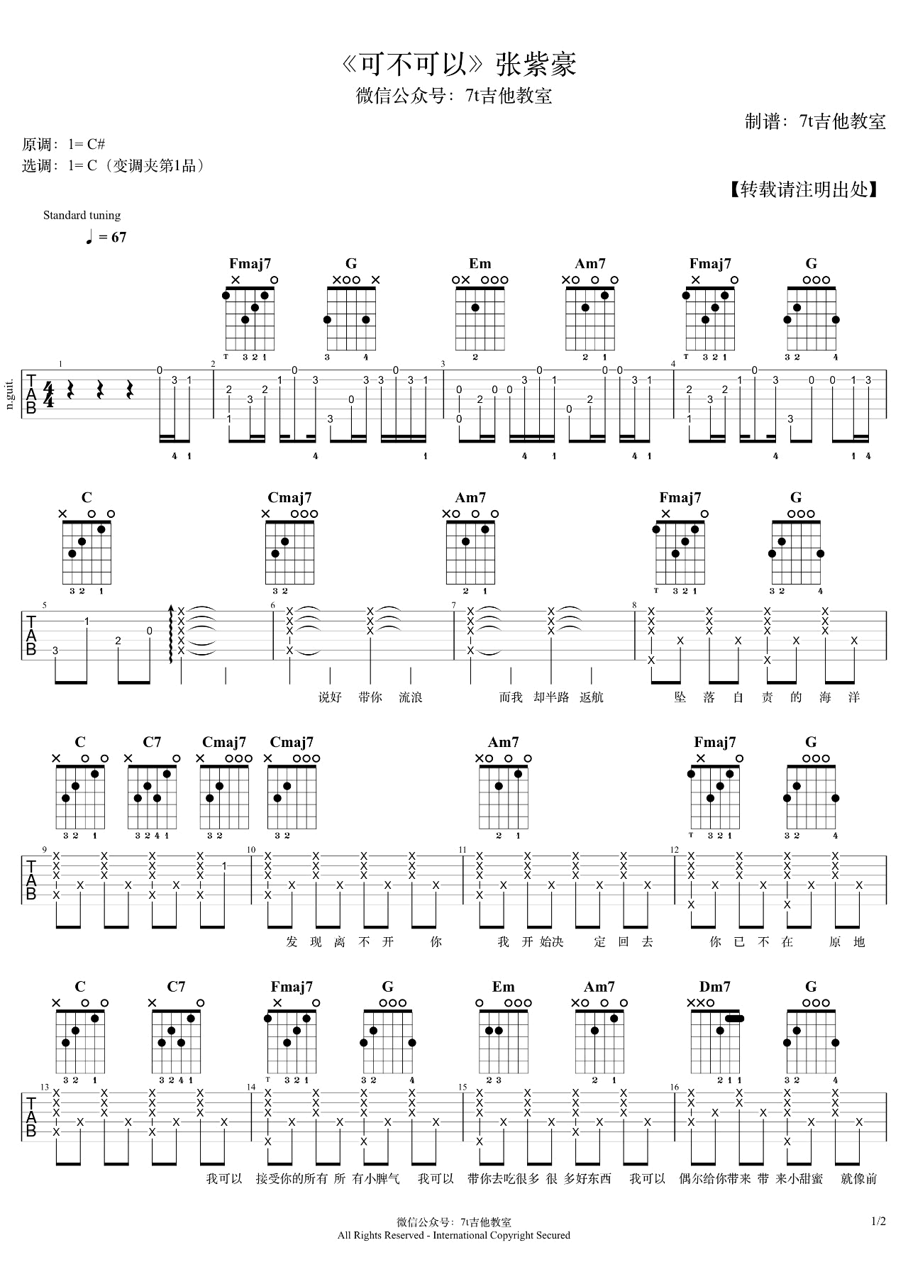 - 可不可以吉他谱 张紫豪 C调和弦谱 弹唱教学视频