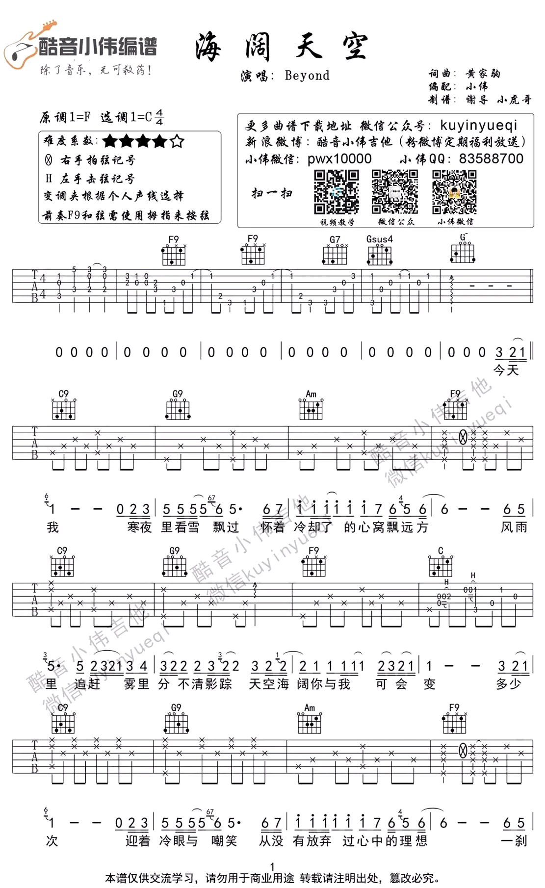 Beyond《海阔天空》吉他谱,原调F,选用C调,变调夹夹根据个人声线选择,前奏F9和弦需要使用拇指来按弦。海阔天空六线谱,三张图片谱,感谢小伟编配,随谱同时附上吉他弹唱教学,方便同学们观看弹唱演示和讲解视频。一首经典歌曲,超越语言与音乐,成为一种信念、信仰与力量。