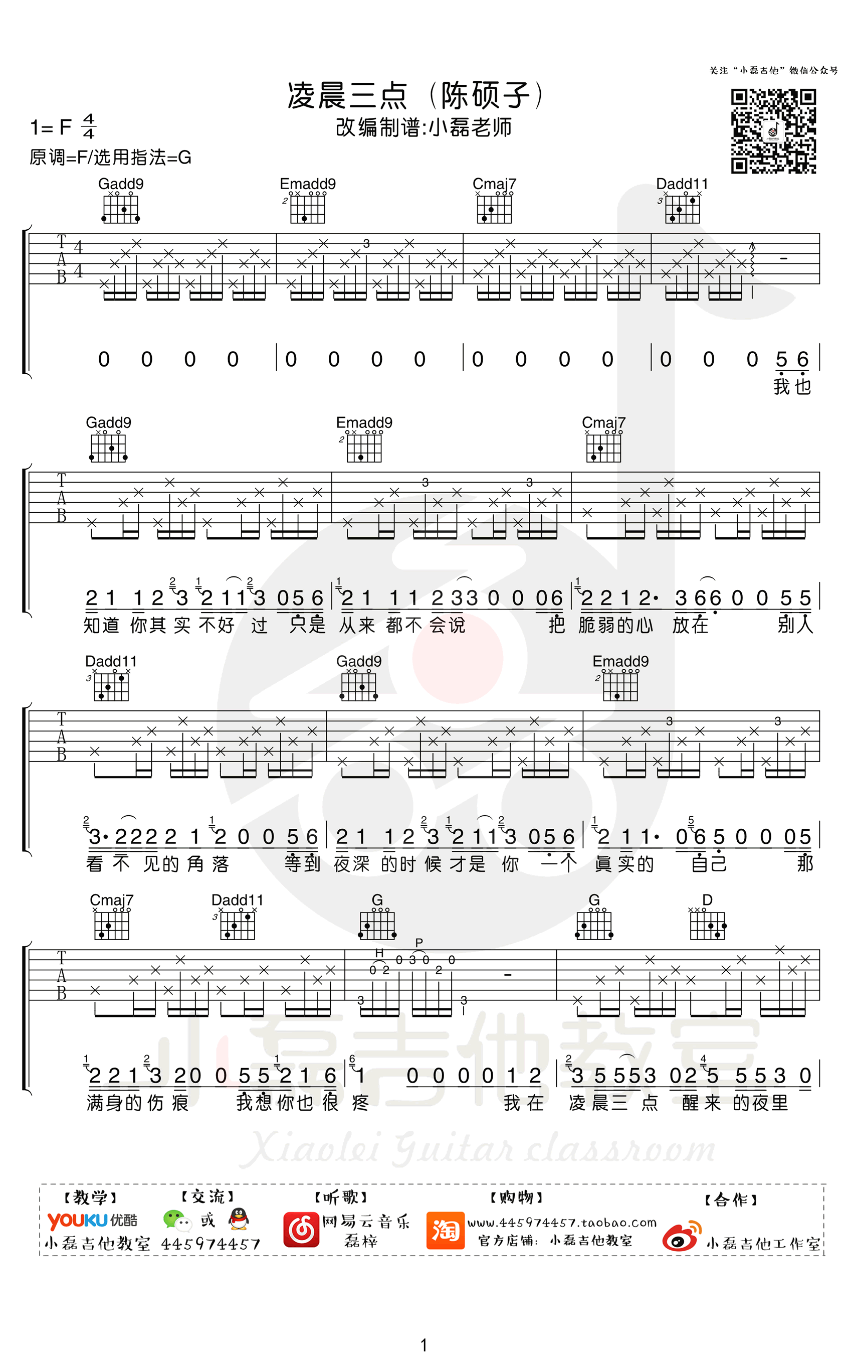 凌晨三点吉他谱,陈硕子演唱的一首网络热门民谣歌曲,选用G调指法,凌晨三点六线谱,四张高清弹唱图片谱,感谢小磊吉他编配,易唱网上传分享。关于乐谱与教学!我们先从乐谱说起,这首歌原版是F调,所以你会在网络上发现大量的C调指型,变调夹在5品的乐谱!但是制作乐谱又怎么能不用心,变调夹品位太高,注定会使吉他的音色变得尖锐,从而失去很多演奏色彩!我们在定调的时候特意把这首歌变成G调版本,相比原版虽然升了一个调,但是大部分男生还是可以接受的(因为原版也不高),但是这样的话演奏效果就好太多了,这也是老师制作乐谱的用心之处!这首歌的难点在于间奏和弹唱结合,因为整曲十六分音符比较多,所以操作略微紧凑,大家一定要慢速多练,熟练后以正常的速度演奏!