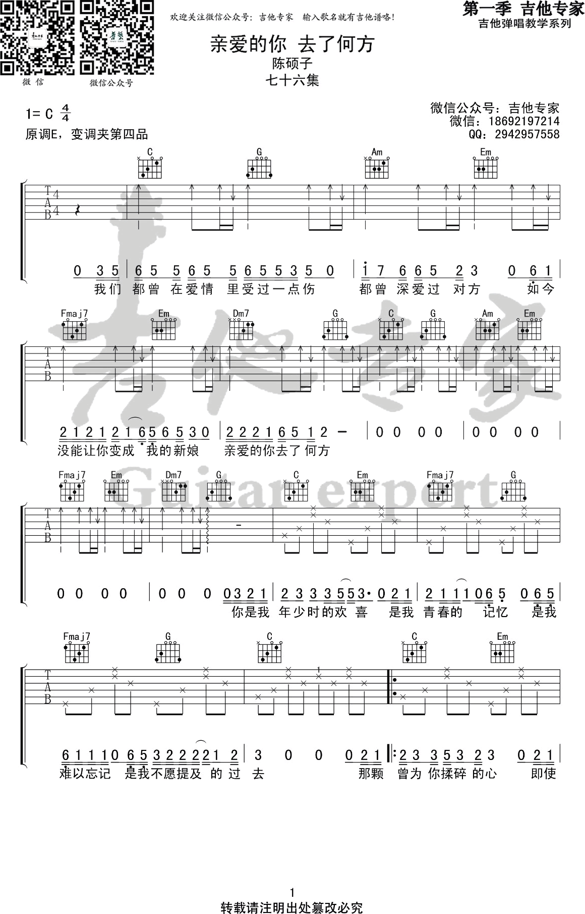 - 亲爱的你去了何方吉他谱_陈硕子_C调弹唱谱
