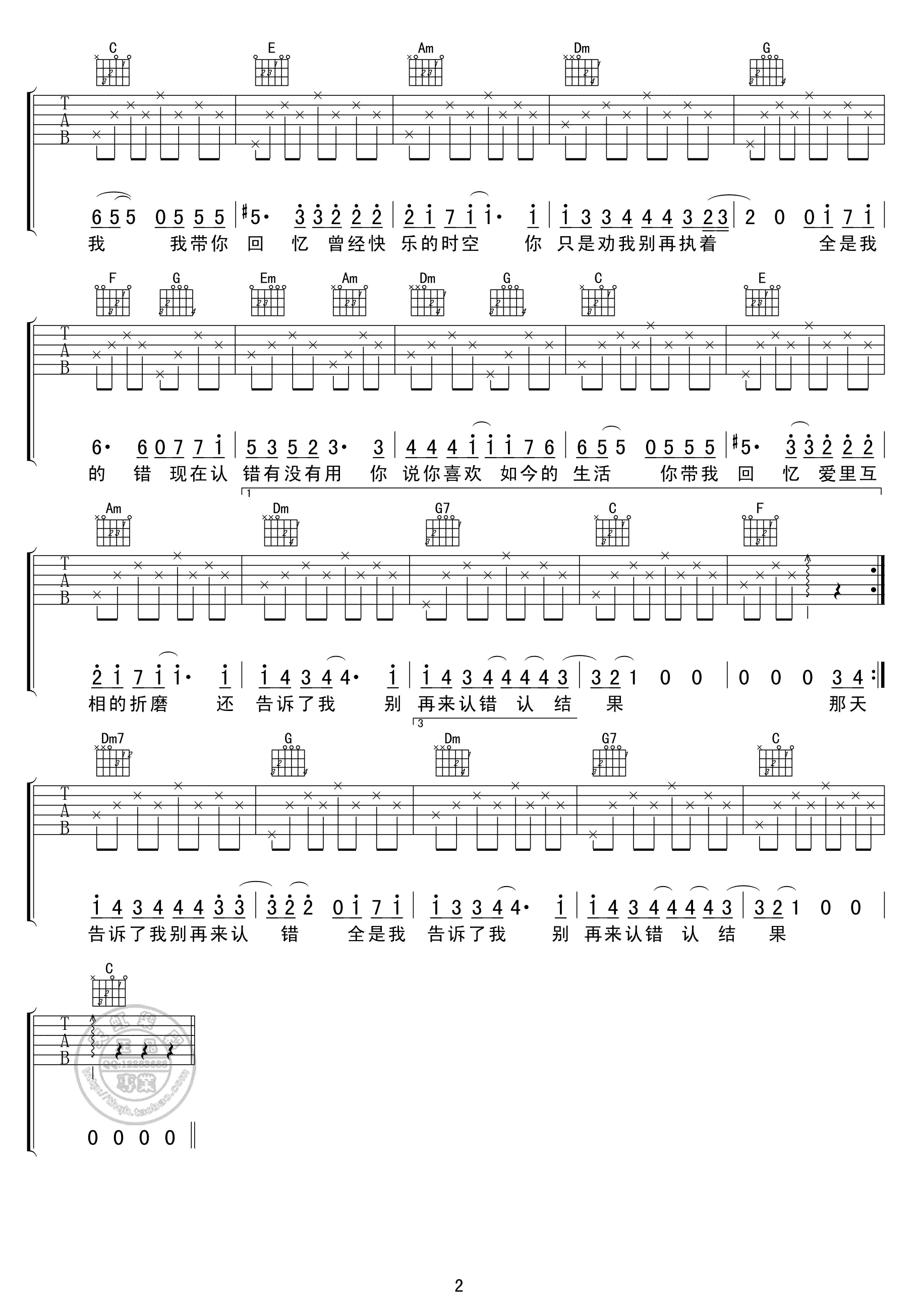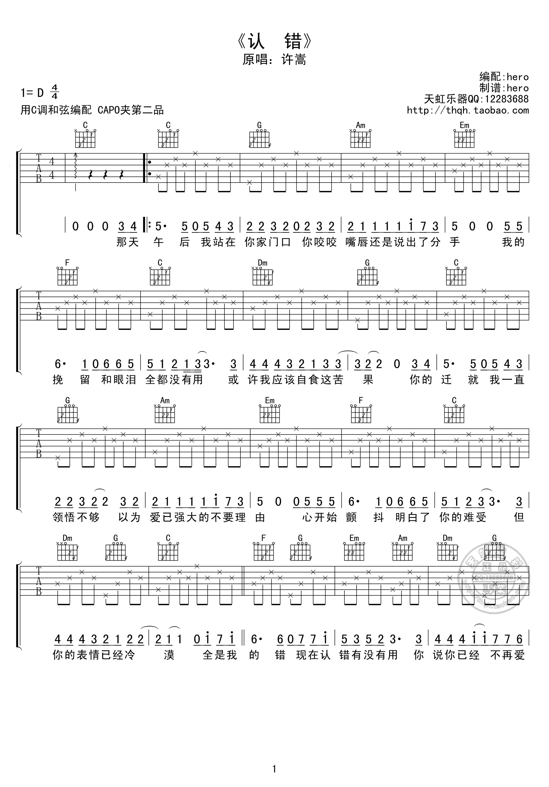 - 许嵩《认错》吉他谱_C调六线谱_高清图片谱