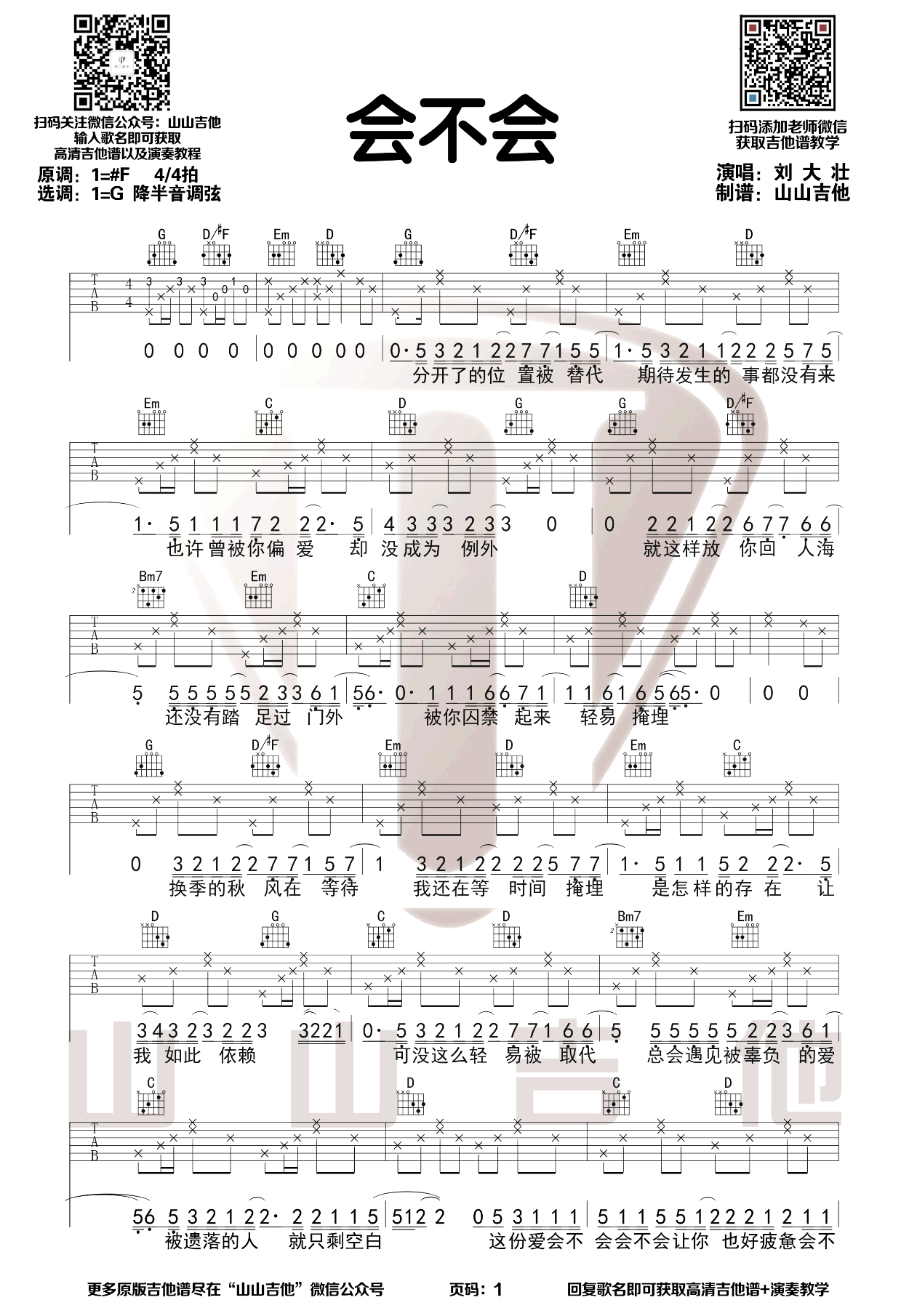 - 刘大壮《会不会》吉他谱_G调_带前奏六线谱
