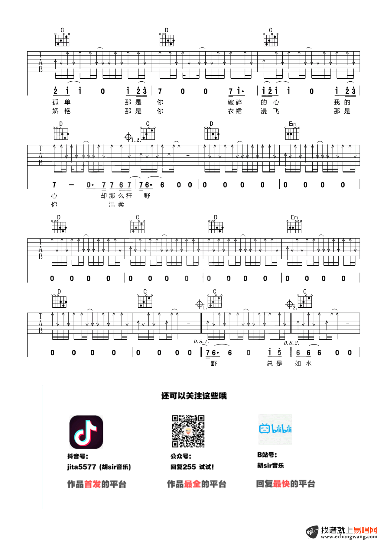 - 野花吉他谱_田震_A调弹唱谱_吉他教学视频