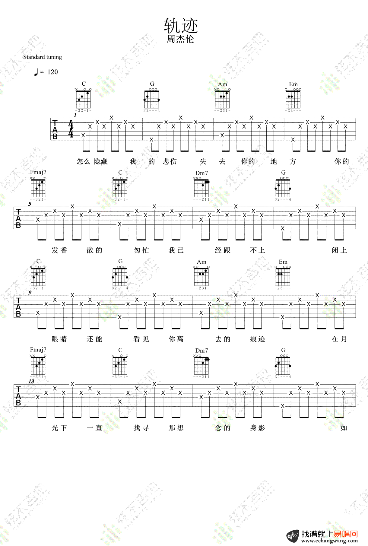 - 轨迹吉他谱C调_周杰伦_简单版_弹唱六线谱