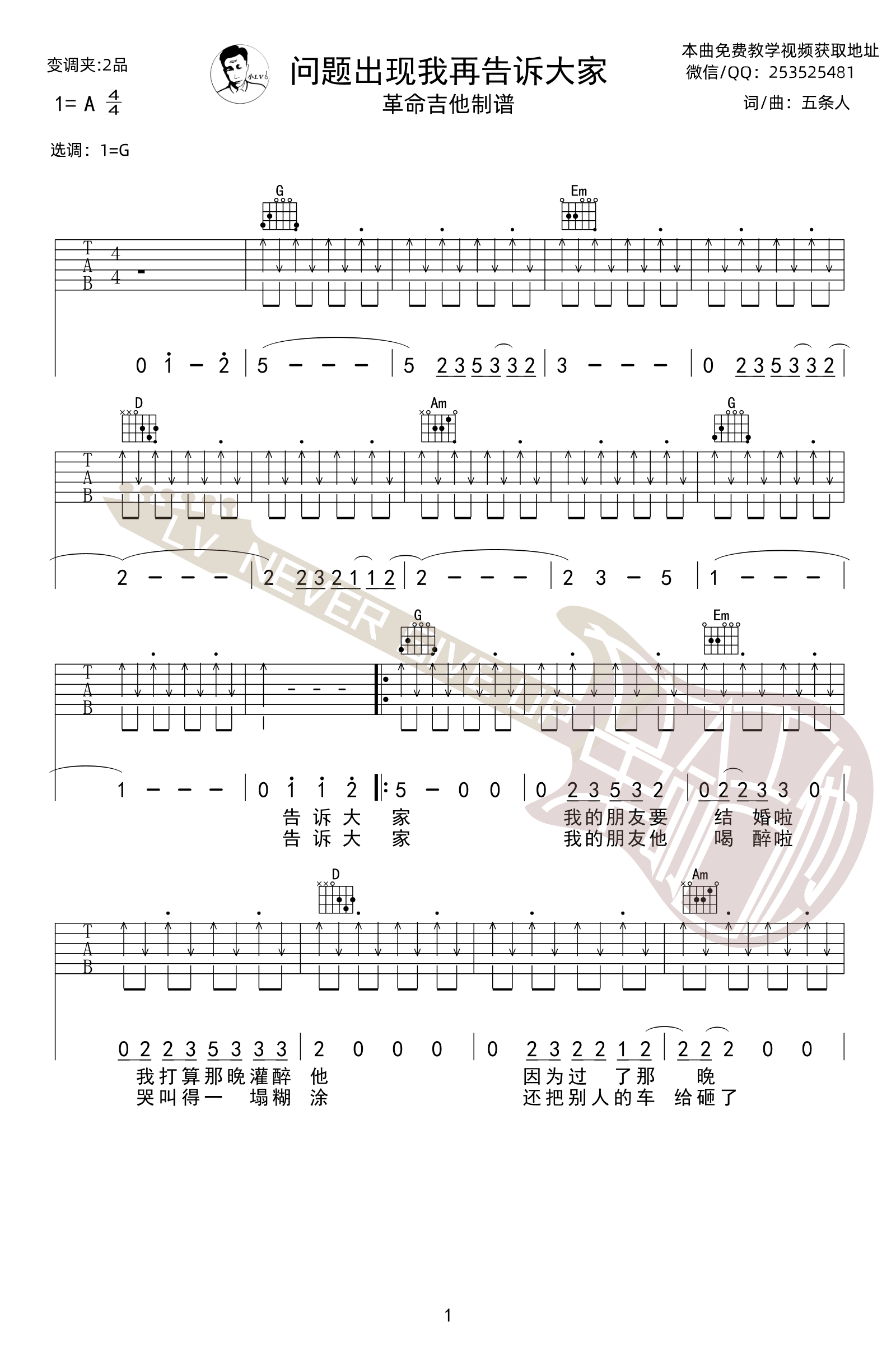 - 问题出现我再告诉大家吉他谱_五条人_G调弹唱谱