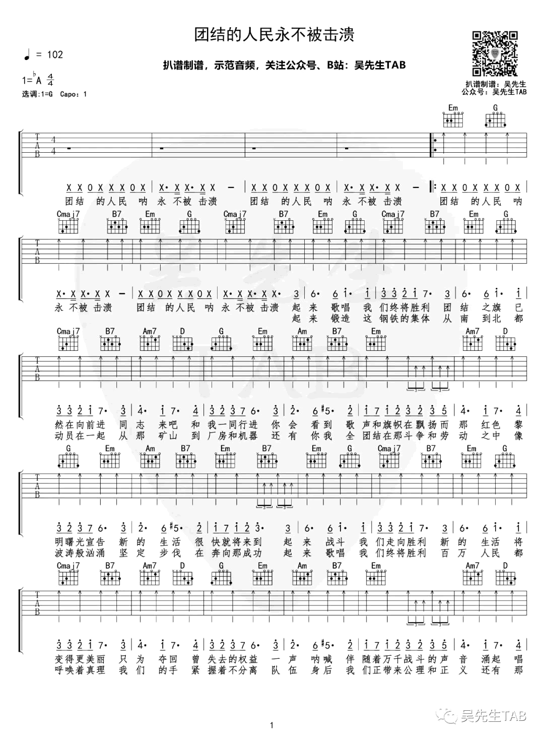 - 团结的人民永不被击溃吉他谱_中文版_G调弹唱六线谱