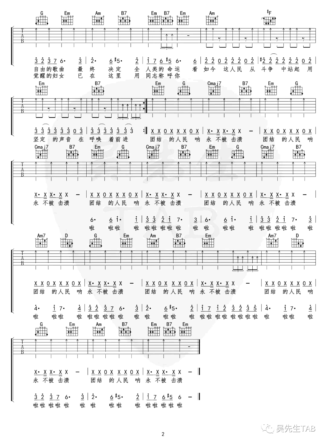 这首歌曲又名《团结人民之歌》,被翻译成世界上的各种语言,为琴友们送上中文版,方便琴友们练习吉他弹唱。
