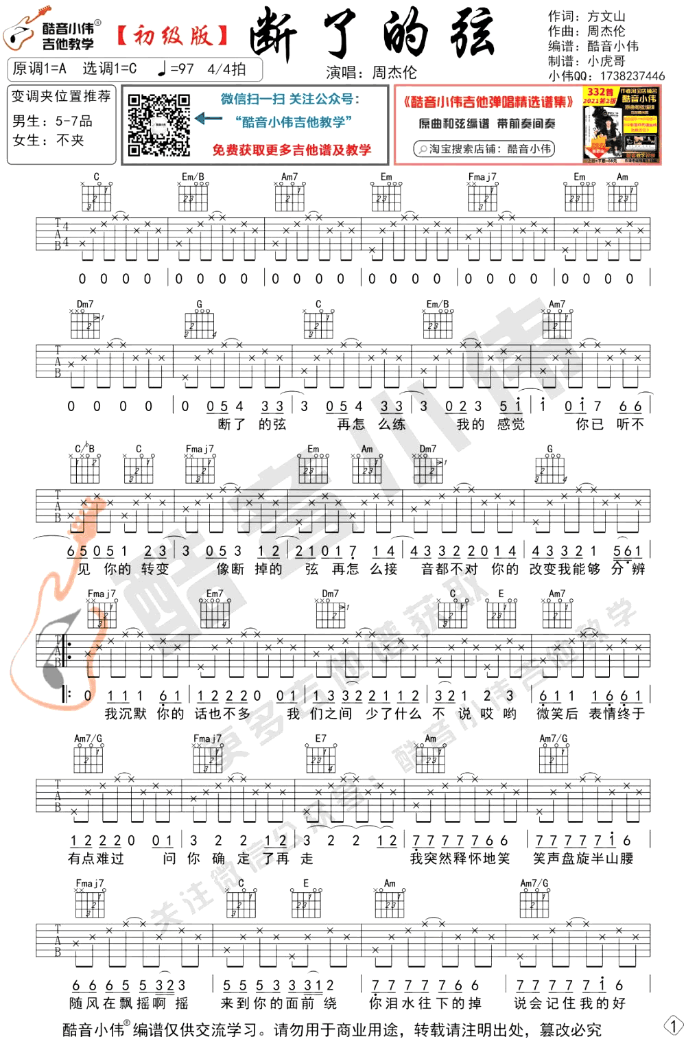 - 断了的弦吉他谱_周杰伦_C调简单版_弹唱六线谱