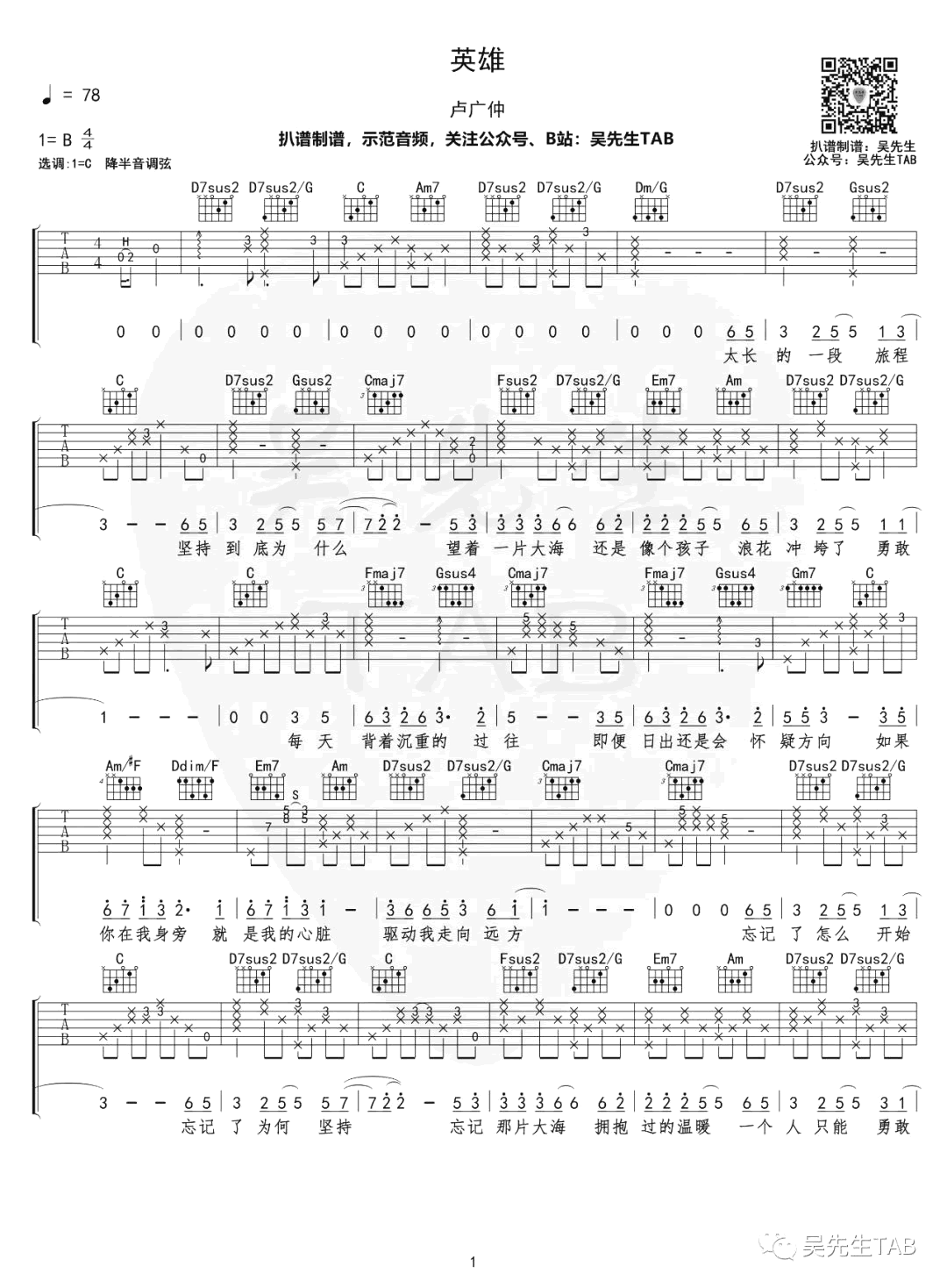 英雄吉他谱,卢广仲演唱,动画电影《诸葛四郎-英雄的英雄》主题曲。英雄吉他弹唱六线谱,原调B,选调G,降半音调弦,两张弹图片谱。感谢吴先生TAB制谱分享,易唱网更新上传。这是关于你我一段旅程、为怀疑生活的人们温暖打气的歌曲。在成长的路途我们背负厚重的行囊前行,等待着前方微弱但充满希望的的曙光, 做自己的英雄,继续努力坚强。