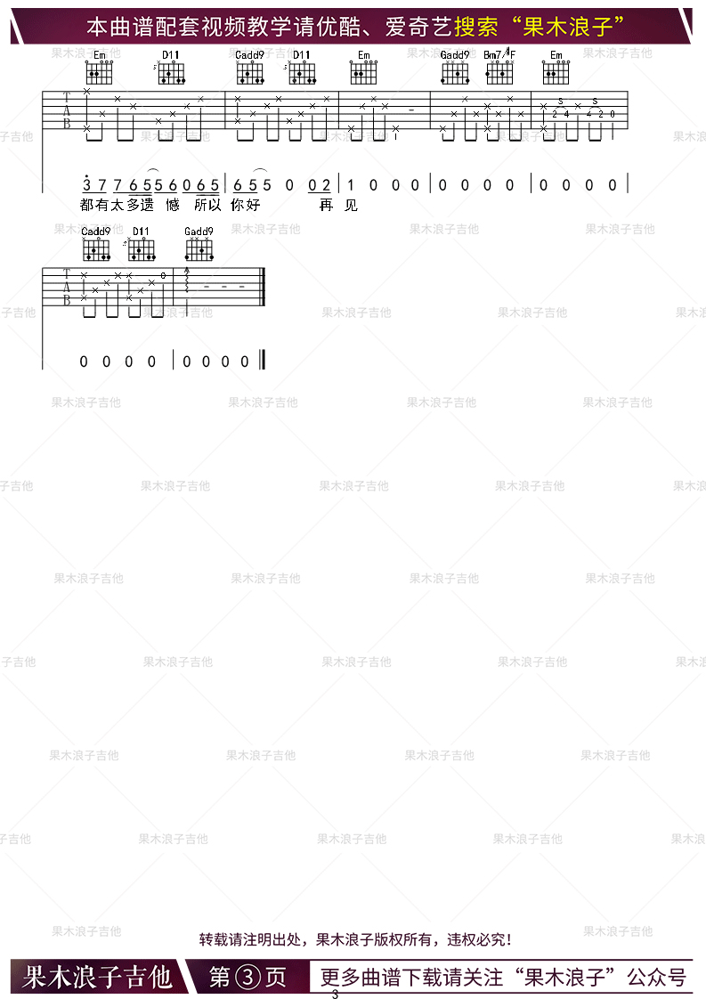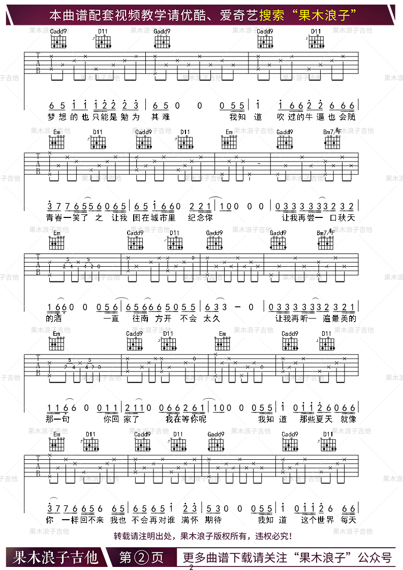 - 宋冬野《安和桥》吉他谱 G调高清版 六线谱