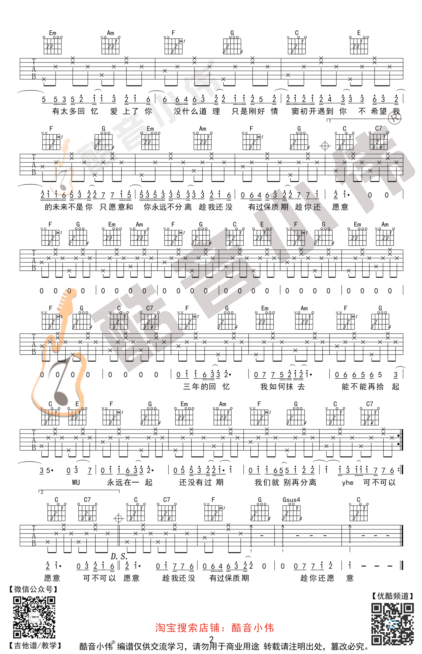 - 不能忘不能爱吉他谱 C调 曹越 高清图片谱