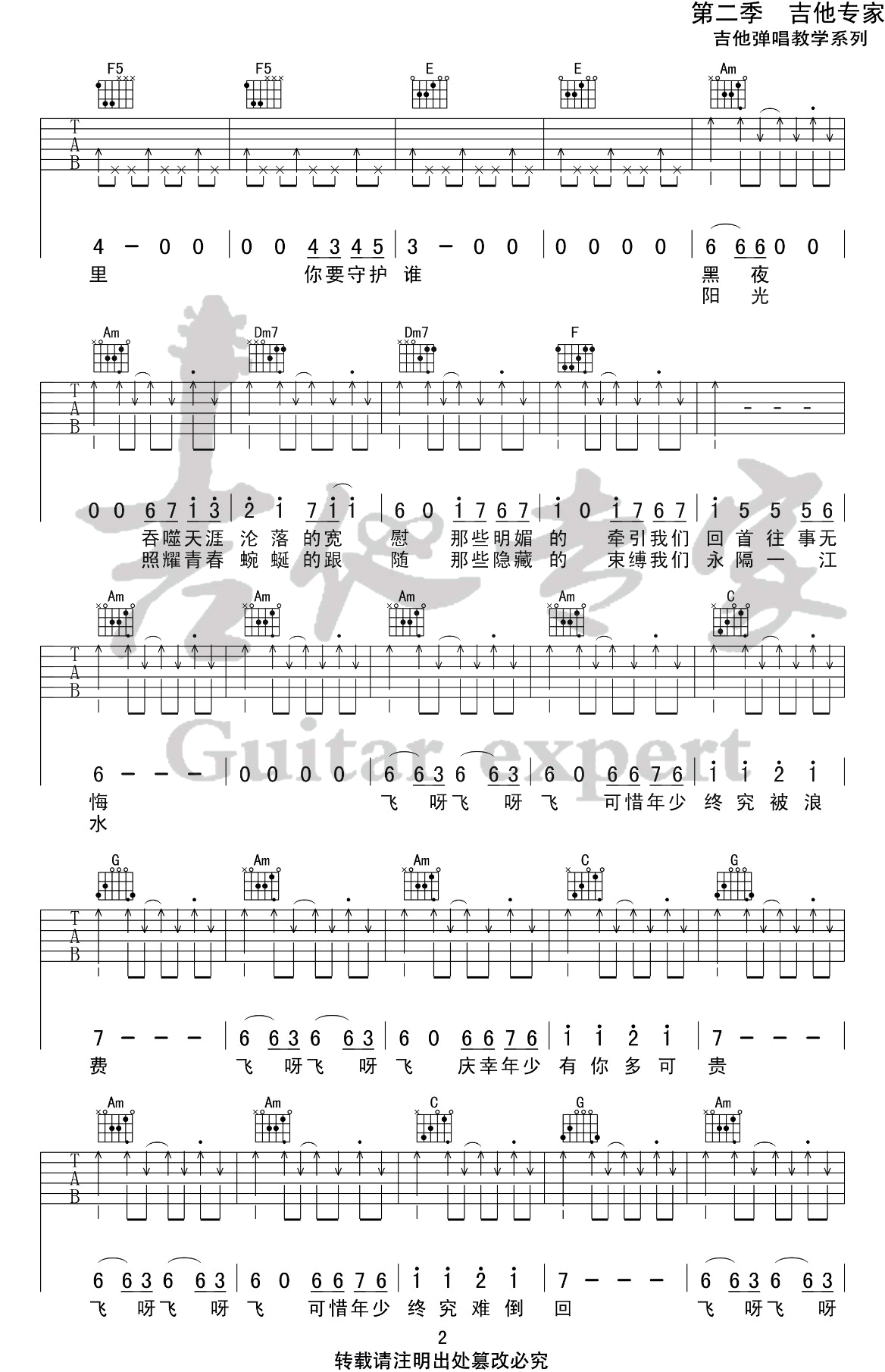 - 王菲《致青春》吉他谱_C调精华版_弹唱六线谱