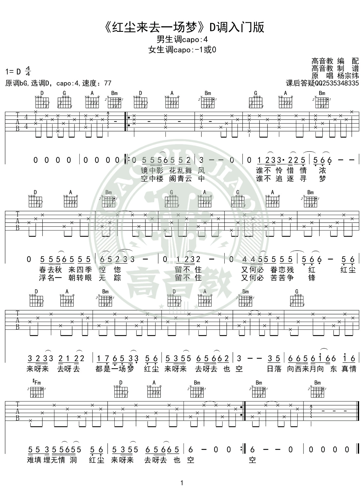 - 红尘来去一场梦吉他谱_杨宗纬_D调入门版_简单弹唱谱