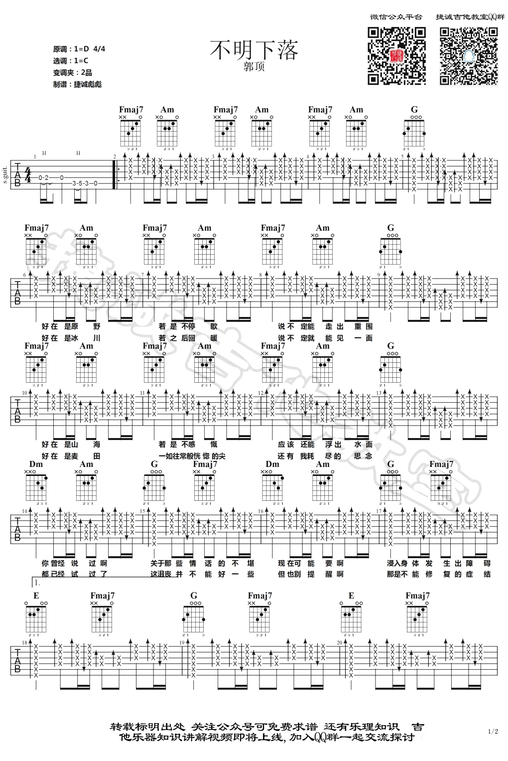 郭顶《不明下落》吉他谱,原调D,选调C,变调夹2品,不明下落六线谱,两张图片谱例,感谢捷诚吉他教室编配出品,易唱网上传更新。