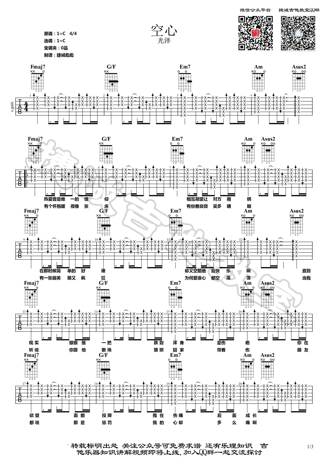 光泽《空心》吉他谱,C调和弦编配,空心吉他六线谱,弹唱谱共三张图片,捷诚吉他教室编配出品,随谱附上彪彪老师带来的曲谱配套吉他弹唱教学视频,易唱网整理分享。