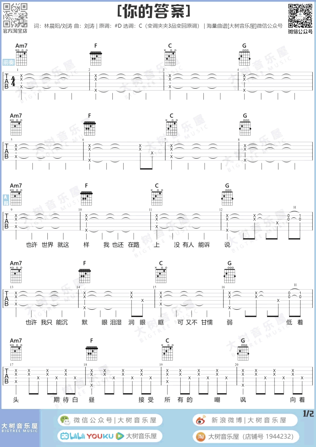 《你的答案》吉他谱,阿冗演唱的一首网络热门歌曲,原调升DA,选用C调指法编配,变调夹夹第三品变回原调音高。大树音乐屋出品,老师提供了吉他和弦图片谱和六线谱格式方便琴友们选择练习,易唱网上传更新。