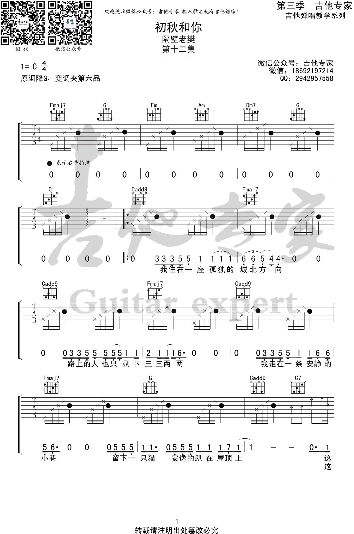 - 隔壁老樊《初秋和你》吉他谱_C调简单版_弹唱谱
