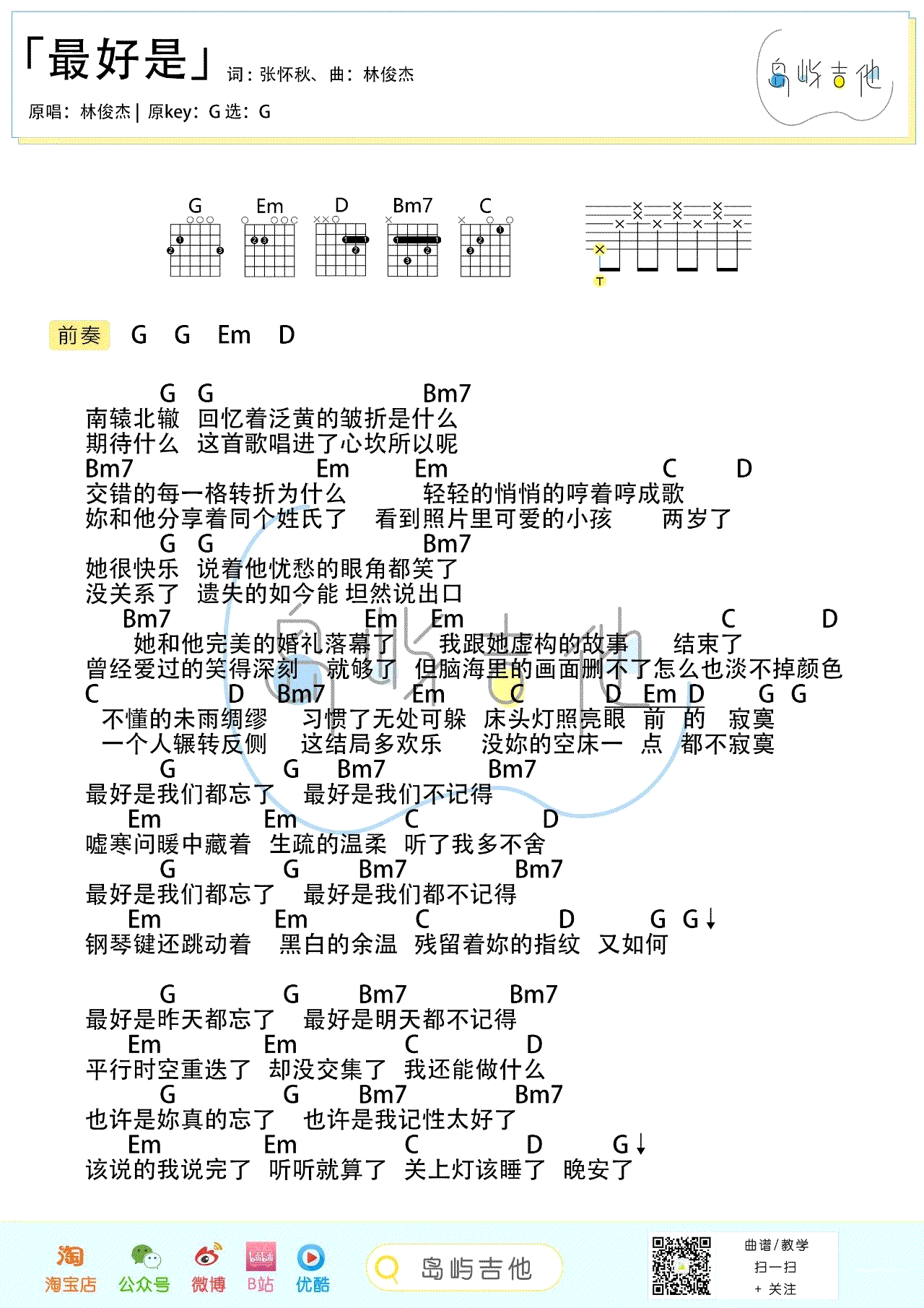 最好是我们都忘了,最好是我们不记得,嘘寒问暖中藏着,生疏的温柔。轻快的旋律,却是最痛苦的情感,明亮的木吉他、干净的配器,纯粹地唱出心里的声音,让我们一起弹唱这悲伤的故事。