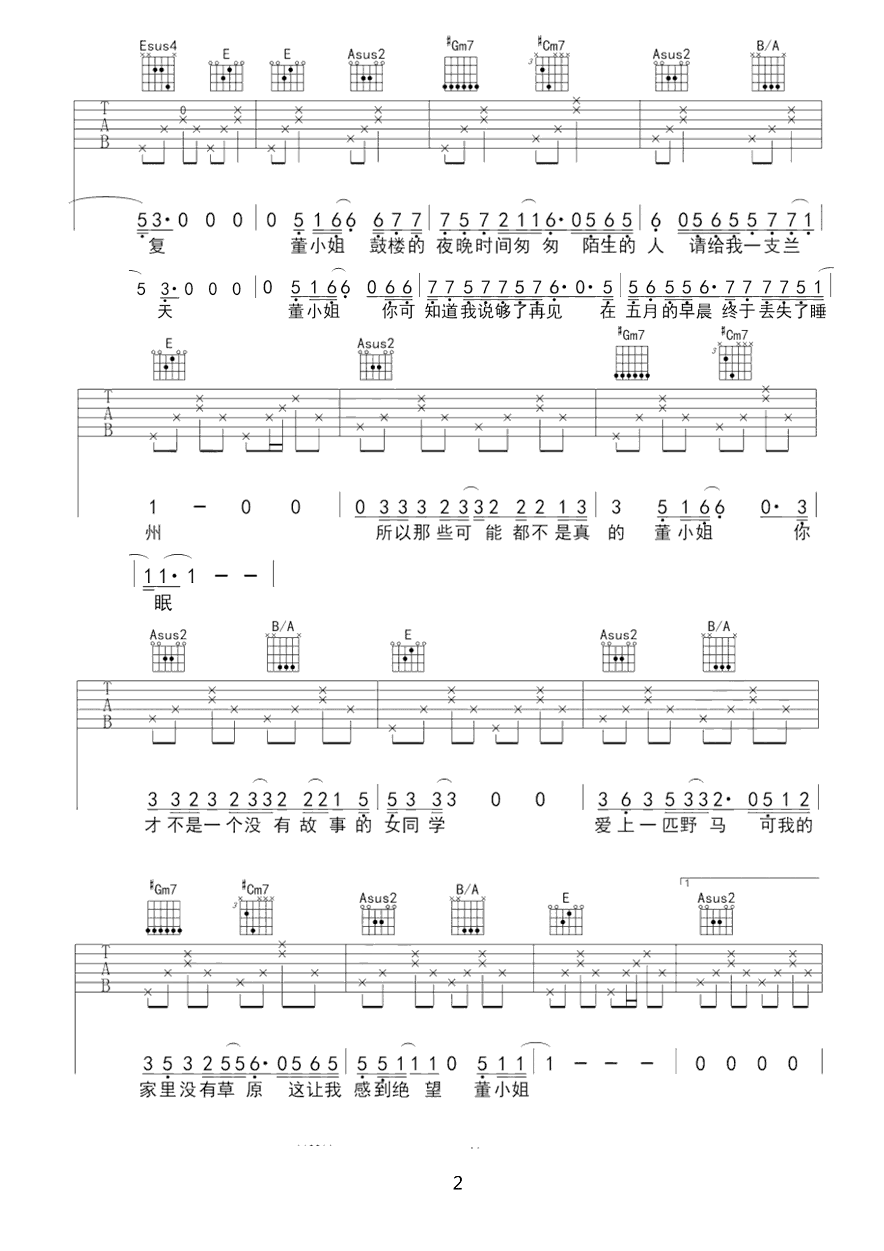 - 宋冬野《董小姐》吉他谱 C调简单版 高清六线谱