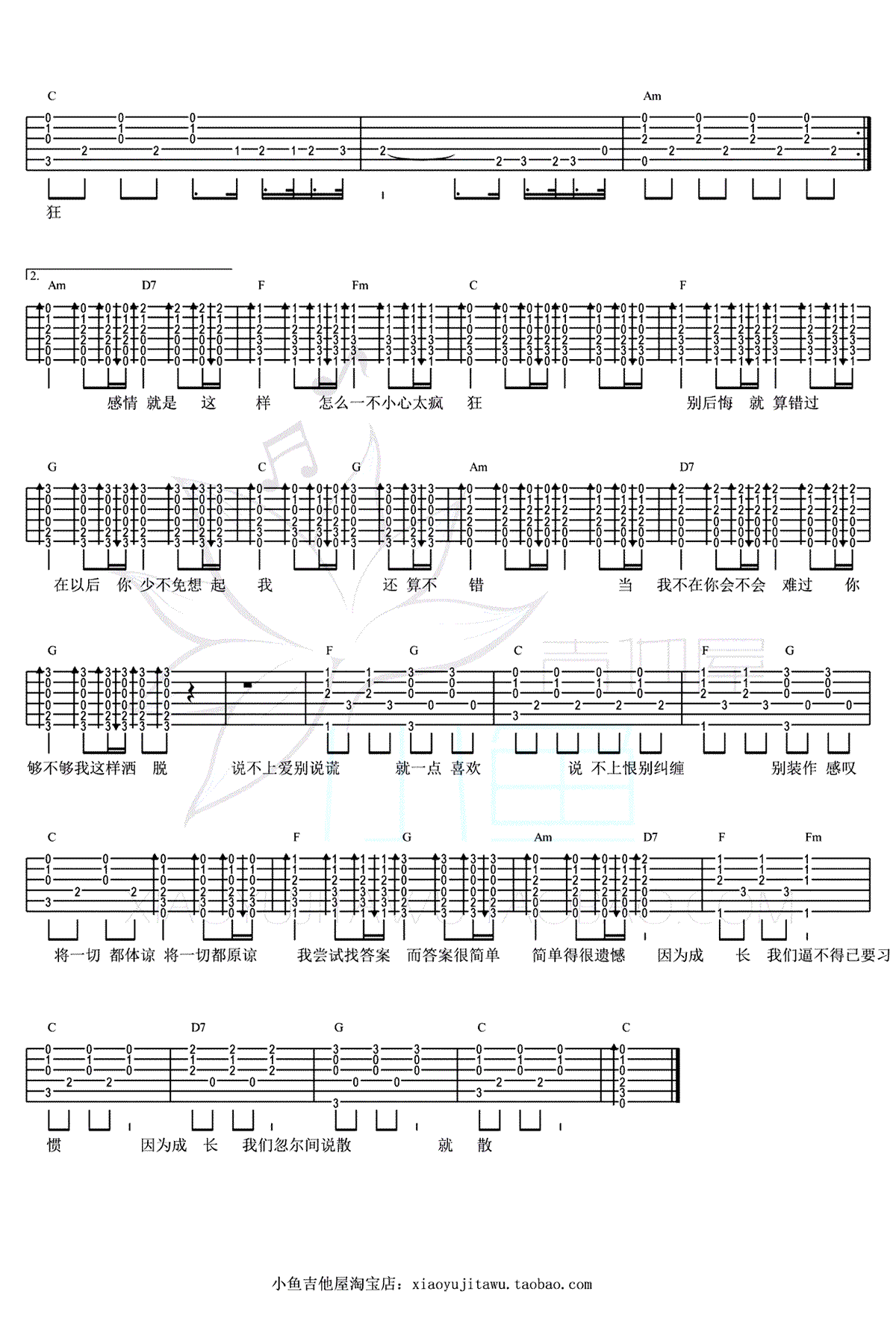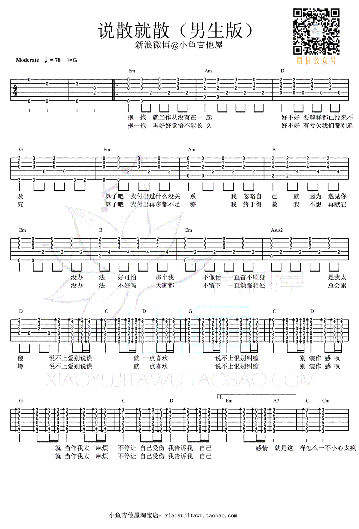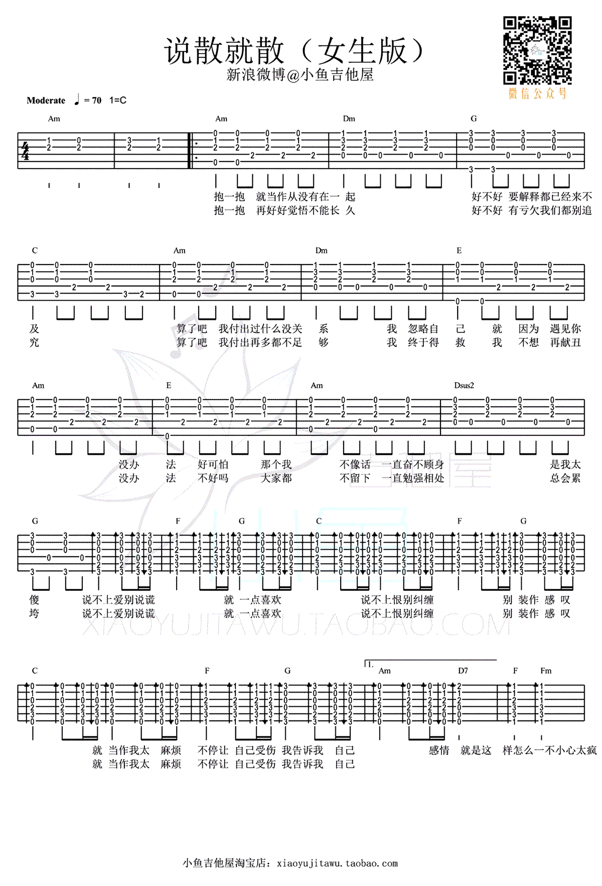 - 说散就散吉他谱 C调 六线谱高清版 弹唱视频演示
