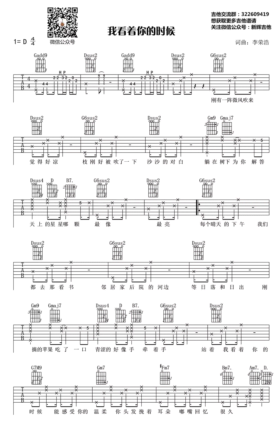 - 我看着你的时候吉他谱 李荣浩 D调六线谱 弹唱教学视频