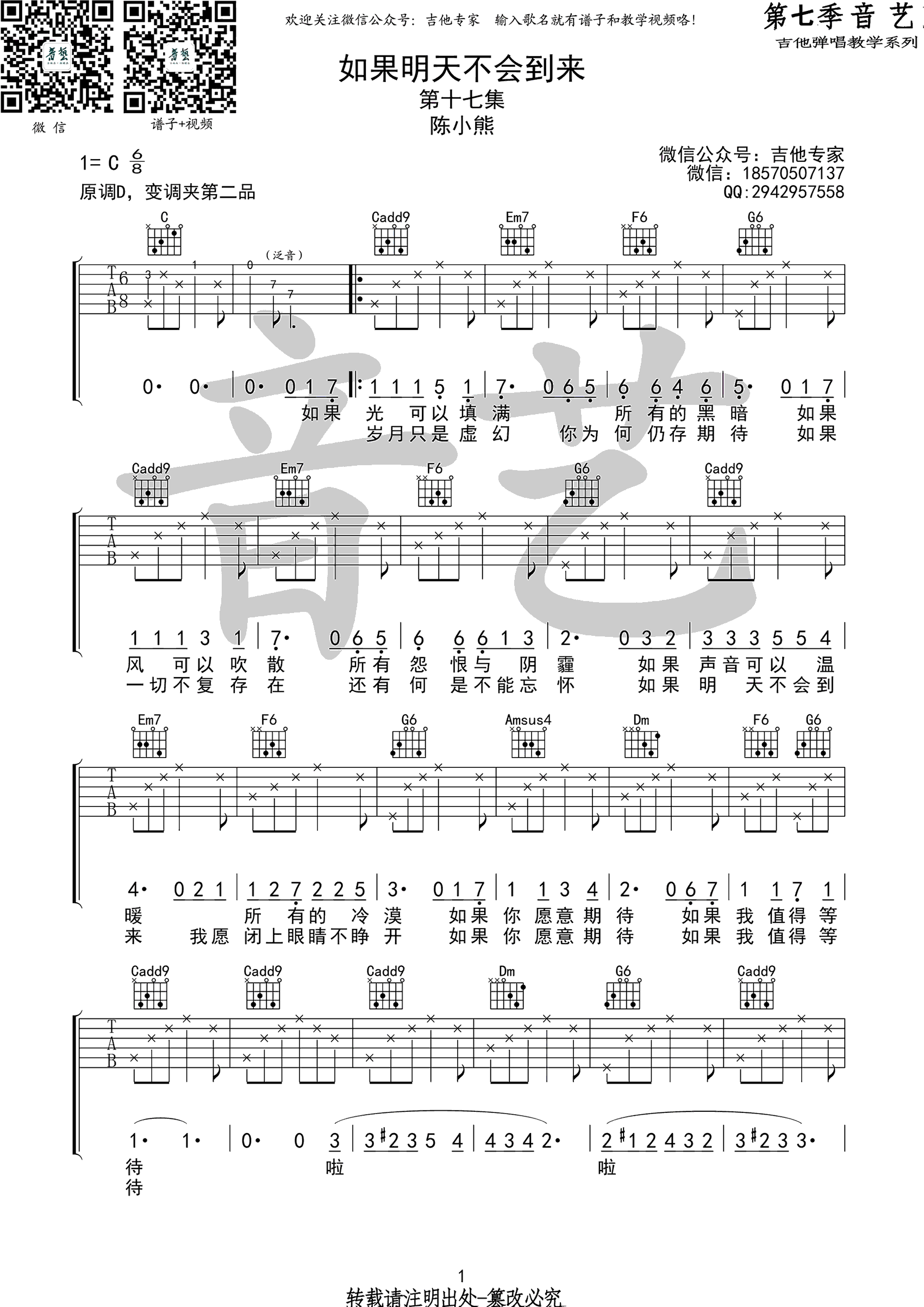 - 小桥吉他谱 暗杠 C调高清六线谱 吉他弹唱谱