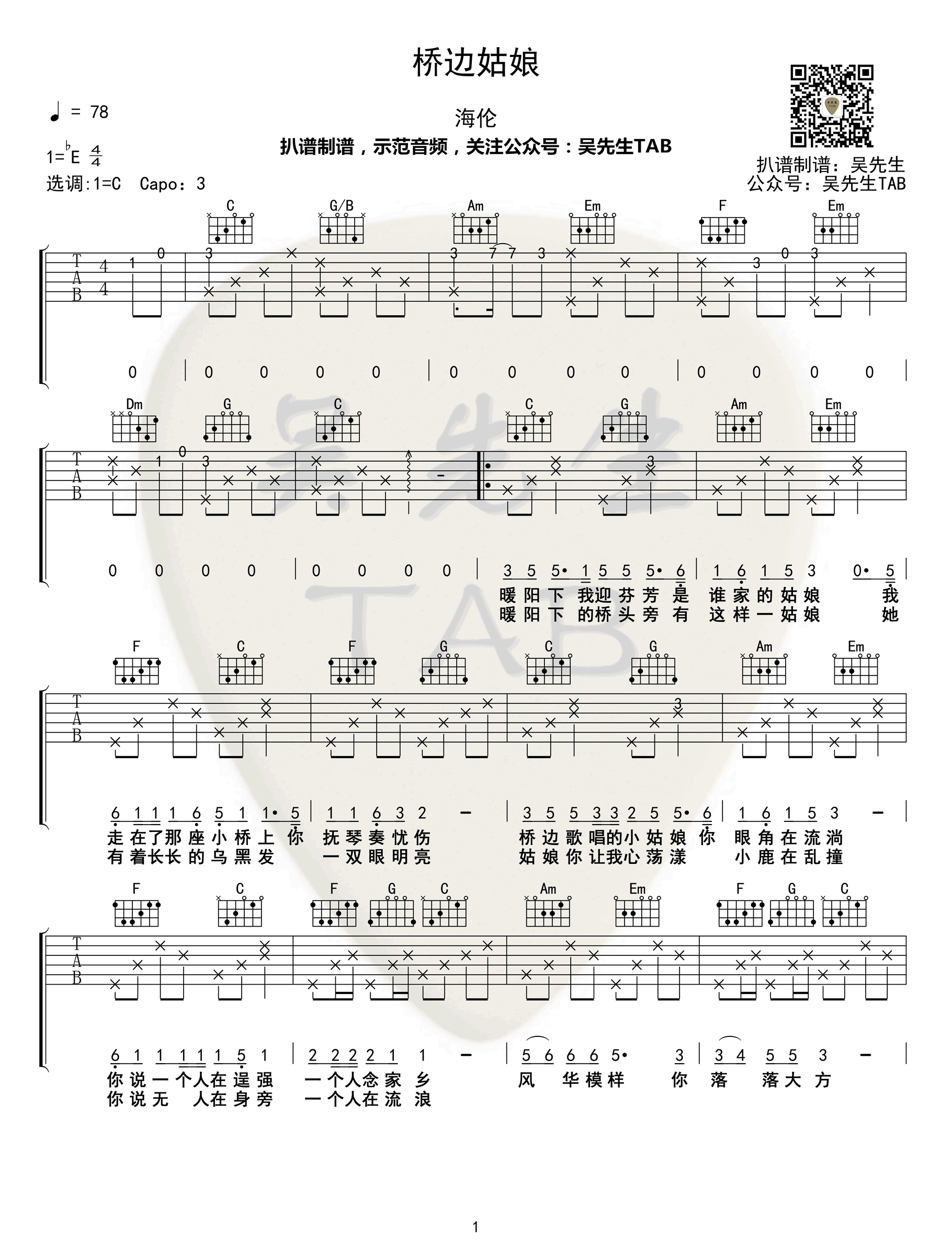 - 桥边姑娘吉他谱_海伦_C调入门版+原版_六线谱
