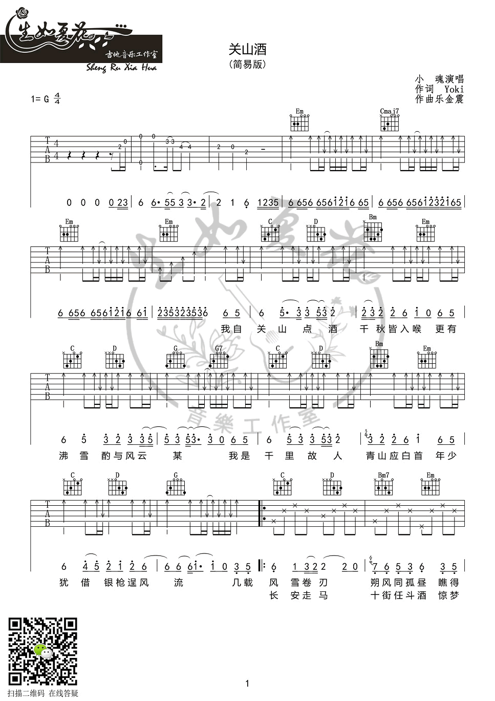 - 关山酒吉他谱_小魂_G调简单版_弹唱六线谱