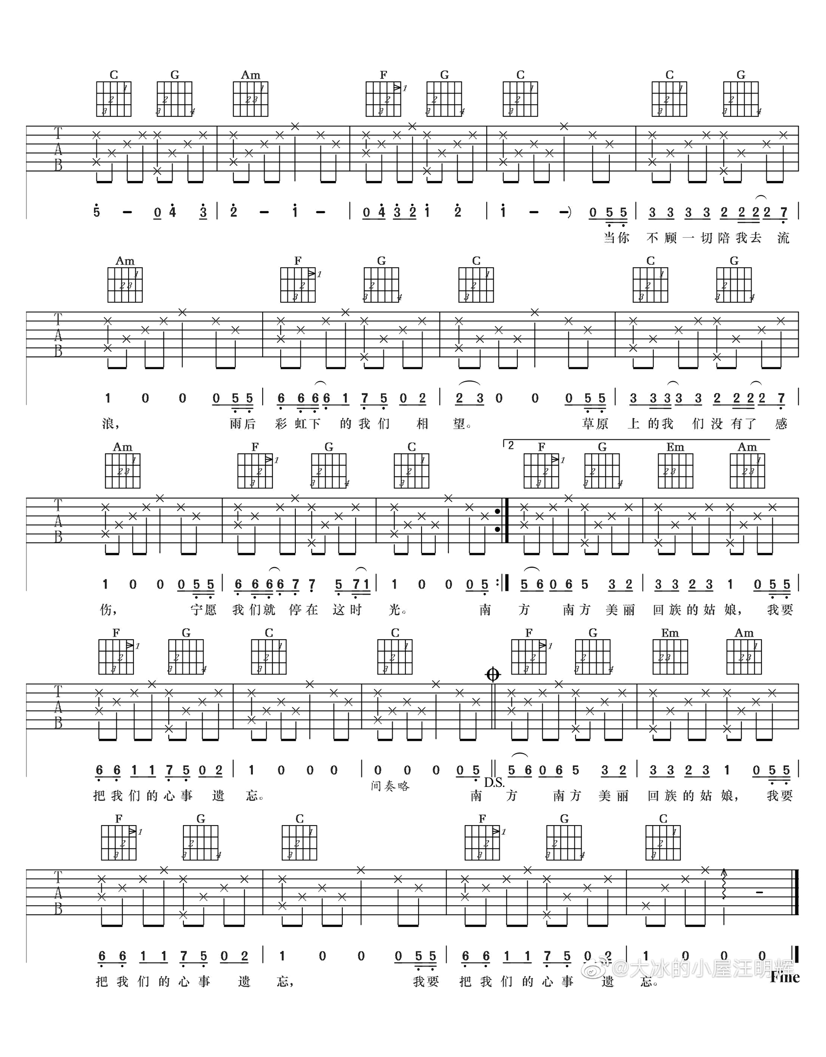 - 回族姑娘吉他谱_大冰的小屋汪明辉_C调_原版六线谱