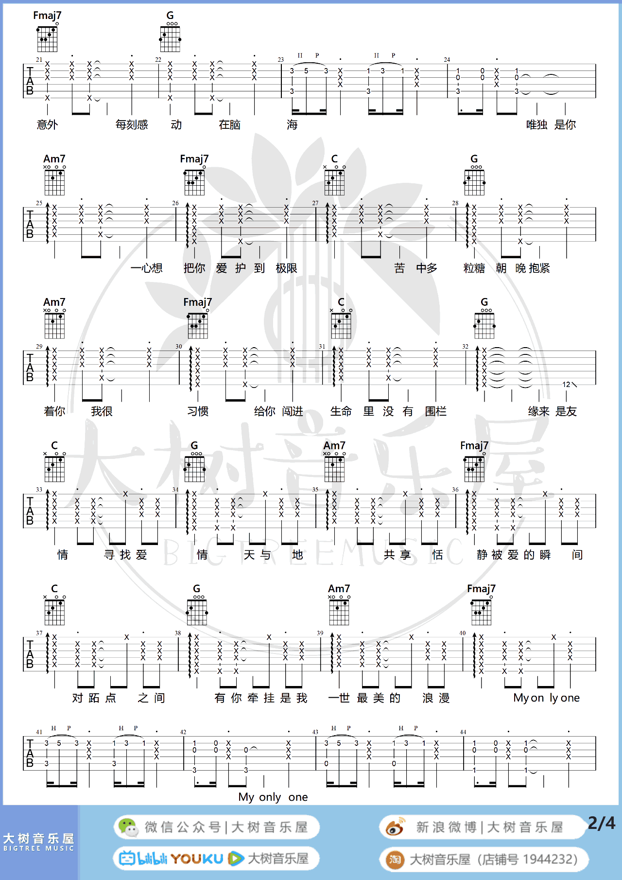 《My Only One》吉他谱,郑中基演唱的一首粤语歌曲,香港电视剧《暖男爸爸》主题曲。My Only One吉他弹唱谱,C调指法,变调夹夹六品回原调F音高,完整版共四张图片六线谱,大树吉他屋出品并带来配套吉他弹唱演示,易唱网www.echangwang.com上传。郑中基这首新歌并非原创,而是改编自哥伦比亚歌手Sebastian 的同名英文歌曲,清晰甜美的曲风,经过粤语填词,整首作品可以说是爱情,也可以说是亲情的温暖之歌。