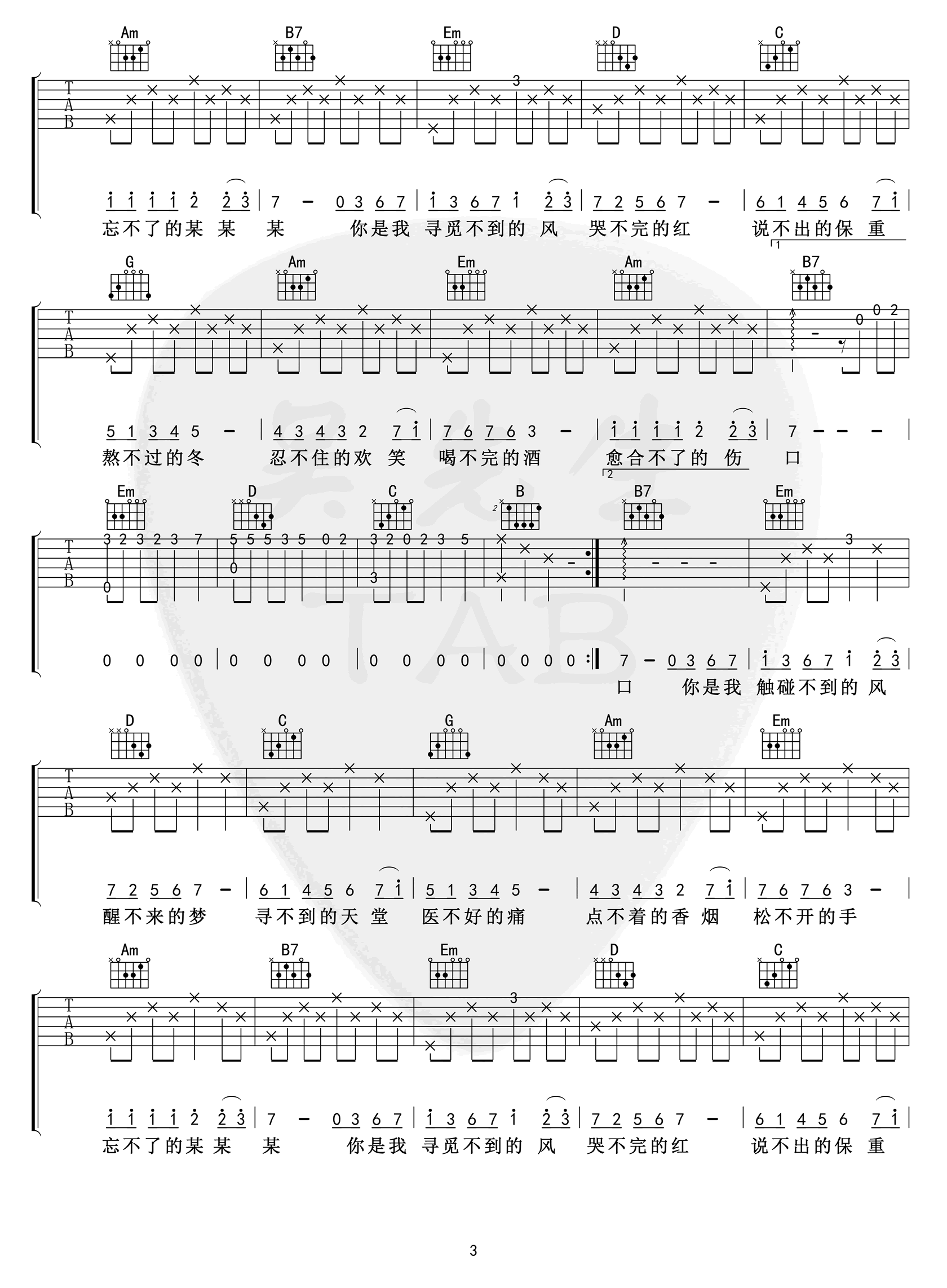 - 三号线吉他谱_刘大壮_C调弹唱谱_完整版六线谱