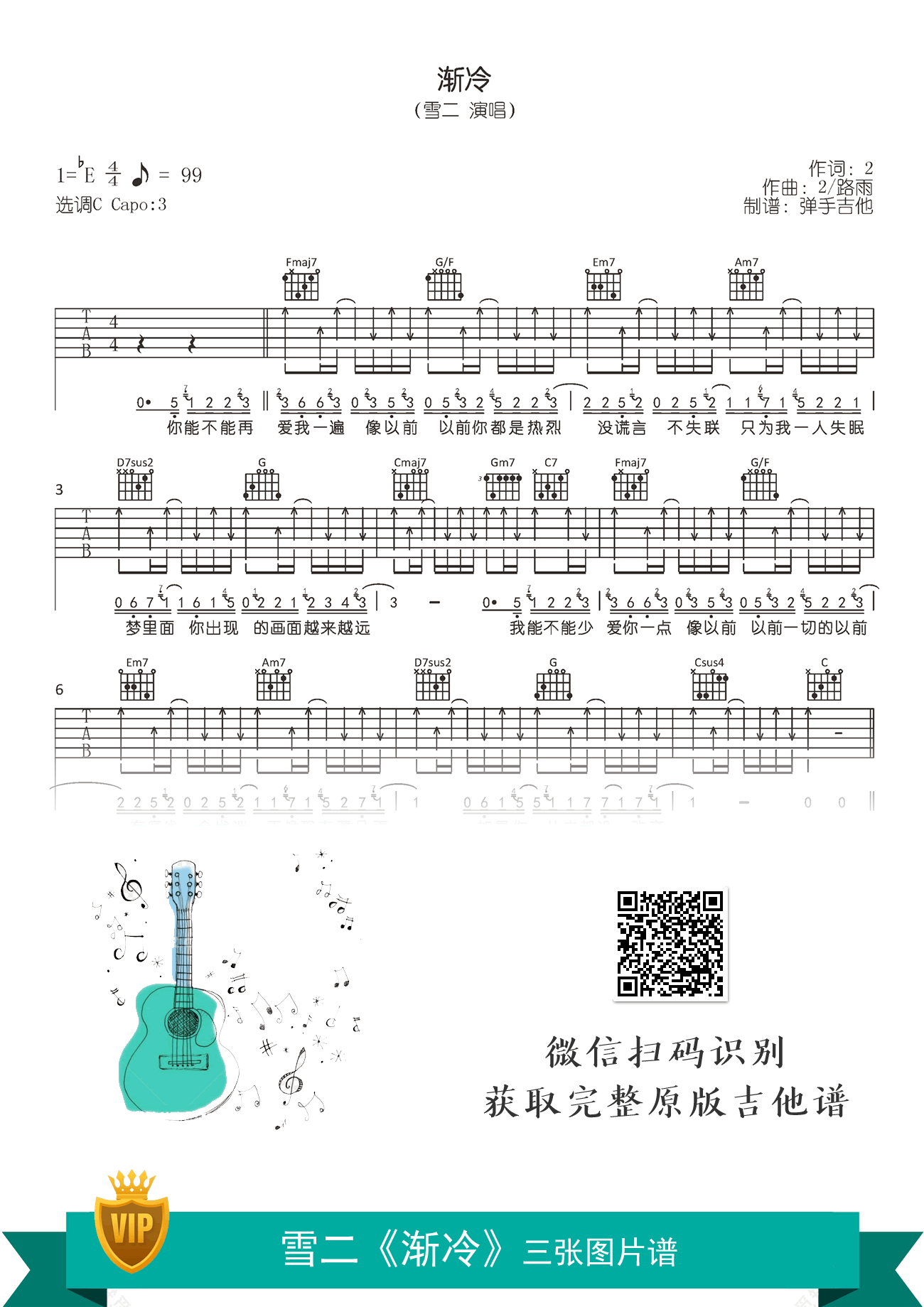 - 渐冷吉他谱_雪二《渐冷》C调弹唱_原版六线谱