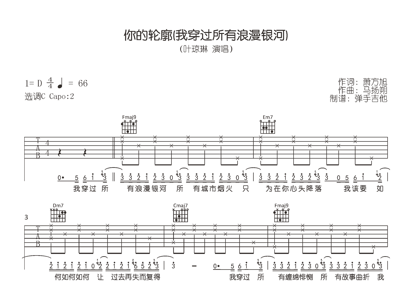 你的轮廓吉他谱,叶琼琳演唱,我穿过所有的浪漫银河,你的轮廓吉他六线谱,原调D选用C调指法,Capo夹二品。完整编配共三张高清图片谱。易唱网整理上传。叶琼琳以其性感磁性的嗓音,深情演绎动听歌曲,星星勾勒轮廓,光影迷人穿梭、寻找过去,难以失而复得,我们看过同一片月色,一起携手共赴星河。