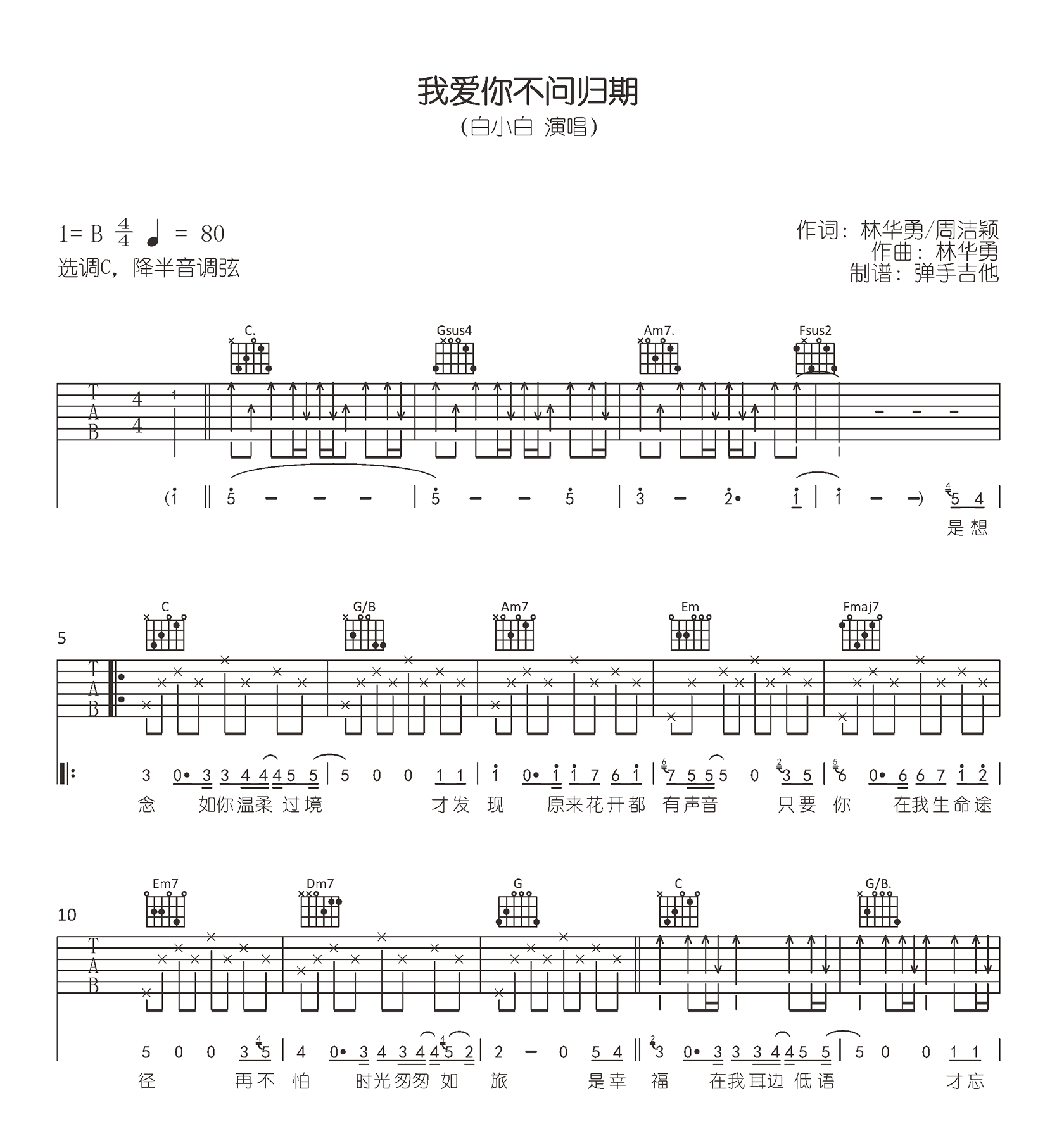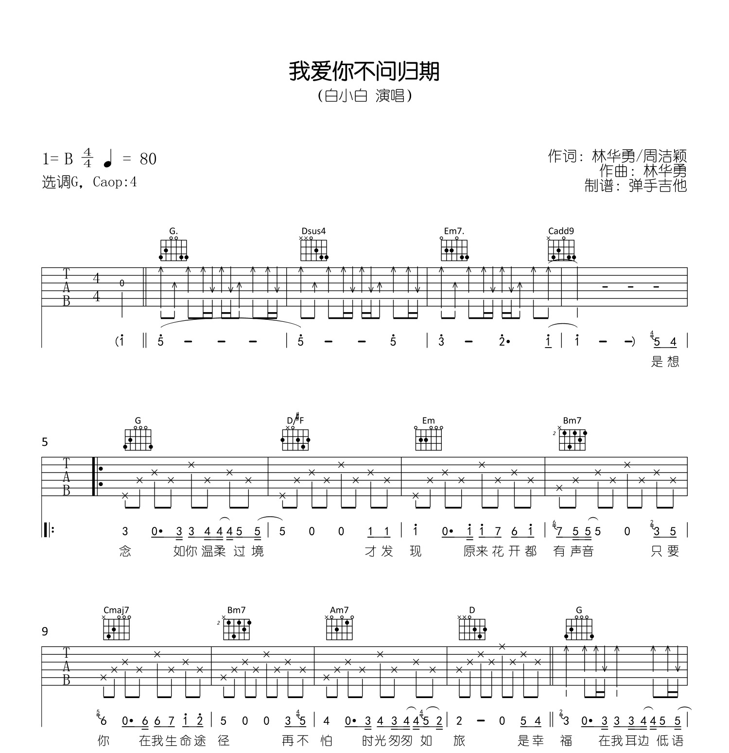 - 我爱你不问归期吉他谱_白小白_C调+G调_原版六线谱