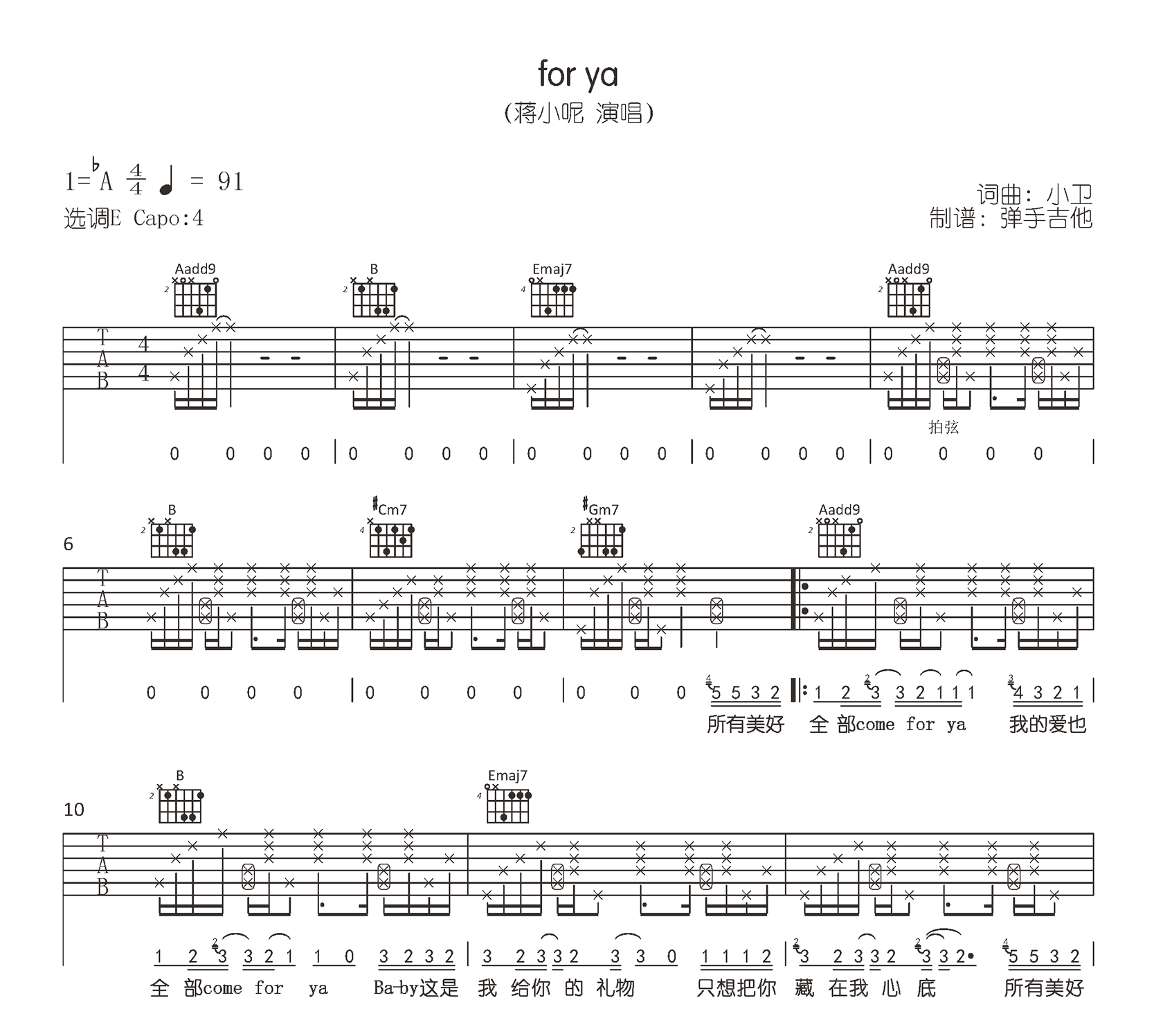 - For Ya吉他谱_蒋小呢_E调弹唱谱_原版六线谱