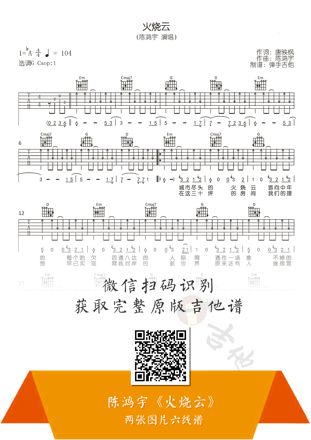 - 火烧云吉他谱_陈鸿宇_G调弹唱谱_高清六线谱