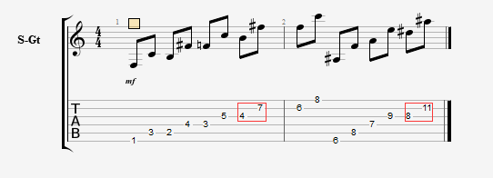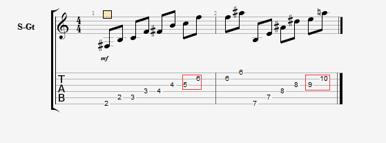 纯五度音程就更简单了,在纯四度基础上再叠加一个全音(继续向右移动两品)即可得到纯五度音程,此规律同样要注意二弦的例外,以下是举例: