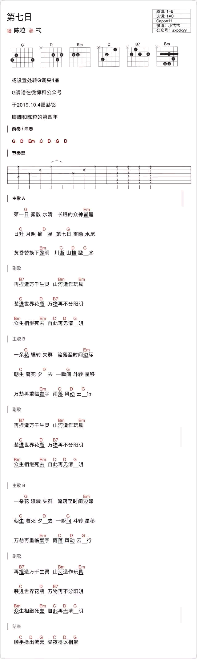 第七日吉他谱_陈粒_C调弹唱谱_和弦图片谱 曲谱类型: 弹唱伴奏谱 编配来源: 爱写谱的小弌弌 演唱(奏): 陈粒 发布于:2019-10-06 热点: 次 曲谱归类: 陈粒吉他谱 第七日吉他谱,陈粒19年发行的新歌作品,这首歌是对自我的审视,穿越过时间,生命依旧坚定。第七日吉他弹唱谱,原调B,选调C,变调夹夹四品,节奏型参照和弦图片谱标注,感谢爱写谱的小弌弌编配,易唱网上传。 创作才女陈粒的全新创作专辑包括《有雾來》、《第七日》、《山水人物》三首歌,这是给自己的生日礼物,也是给歌迷的礼物。歌曲给人“不畏浮云遮望眼,只缘身在最高层”般令人骄傲的孤独,表达了将自我置身于平庸生活之上的开阔大气。 吉他谱和弦图 * 网站内容自网络收集整理而来,仅供爱好者学习交流,版权归其原作者,若侵犯了您的合法权利,请与我们联系,我们将立刻处理。 上一篇:颜人中《晚安》吉他谱_和弦编配_弹唱谱 下一篇:没有了 推荐吉他谱 陈奕迅吉他谱 陈绮贞吉他谱 水木年华吉他谱 品冠吉他谱 宋冬野吉他谱 郑智化吉他谱 王菲吉他谱 周杰伦吉他谱 薛之谦吉他谱 莫文蔚吉他谱 吉他教学吉他谱 戴佩妮吉他谱 严爵吉他谱 MP魔幻力量吉他谱 相关吉他谱