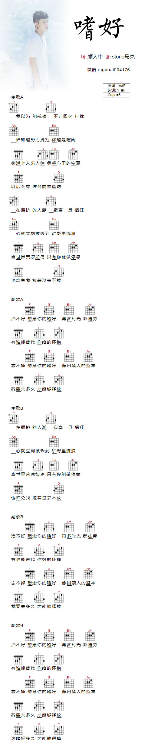 嗜好吉他谱_颜人中_C调弹唱谱_和弦图片谱 曲谱类型: 弹唱伴奏谱 编配来源: 网络 演唱(奏): 颜人中 发布于:2019-11-11 热点: 次 曲谱归类: 流行歌曲吉他谱 颜人中《嗜好》吉他谱,原调F,选用C调指法,变调夹夹五品。嗜好吉他弹唱谱,和弦图片谱,感谢琴友stone马亮编配分享,易唱网整理上传。宝藏男孩颜人中送你一首深夜心碎慢情歌,治不好,想念你的嗜好,忘不掉,想念你的嗜好,深情磁性的嗓音,缓缓带出那些破碎的过去,碎片汇成囚禁你的监牢,步步紧逼,你逃不掉。 戒不掉的,才叫嗜好。 吉他谱和弦图 * 网站内容自网络收集整理而来,仅供爱好者学习交流,版权归其原作者,若侵犯了您的合法权利,请与我们联系,我们将立刻处理。 上一篇:信《痞子的情书》吉他谱_和弦弹唱谱 下一篇:没有了 推荐吉他谱 陈小春吉他谱 琴歌吉他谱 马頔吉他谱 SHE吉他谱 万芳吉他谱 张震岳吉他谱 民歌名曲吉他谱 万晓利吉他谱 王菀之吉他谱 动力火车吉他谱 宋冬野吉他谱 张碧晨吉他谱 中国好声音吉他谱 中国好歌曲吉他谱 相关吉他谱 晚安吉他谱_颜人中_C调弹唱谱_吉他教学视频 祝你爱我到天荒地老吉他谱_颜人中/毛衍七Vava_C调弹唱谱 孤单心事吉他谱_蓝又时/颜人中_C调_吉他弹唱演示 颜人中《晚安》吉他谱_C调简单版_高清弹唱谱 孤单心事吉他谱_蓝又时/颜人中_和弦弹唱谱 颜人中《晚安》吉他谱_A调指法_简单弹唱谱 晚安吉他谱_颜人中_C调六线谱_高清图片谱 颜人中《晚安》吉他谱_和弦编配_弹唱谱