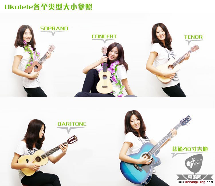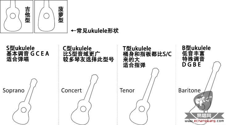 ukulele一般大家常用3种尺寸:S(21寸)C(23寸)T(26寸),当然还有种特殊型号是B型,用的人较少,声音较接近古典吉他,如下图: